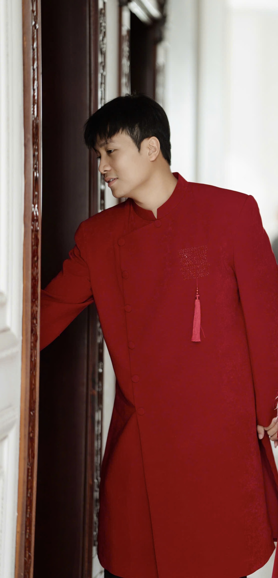 Sản phẩm được may từ chất liệu Lụa da nhung, mềm mịn, sang trọng tạo form nam chuẩn. Thiết kế hoạ tiết chữ HỶ bên ngực tạo điểm nhấn thu hút ánh nhìn.