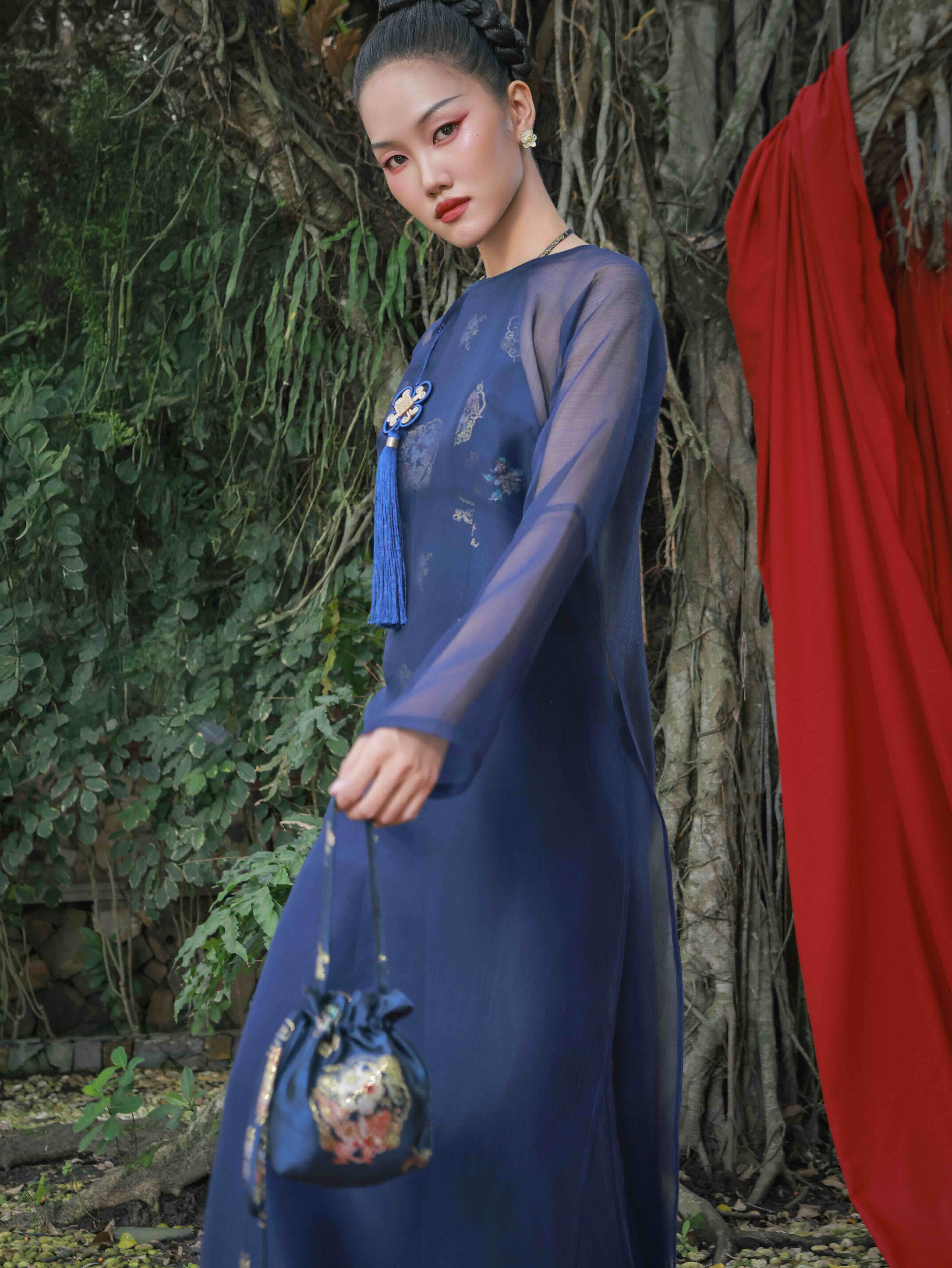 Nguồn cảm hứng của Áo dài Sammy đến từ những biểu tượng tình yêu vượt thời gian (chim công, hoa bướm, cá nước, nghệ thuật điêu khắc …), mềm mại nhưng pha nét quyến rũ của hơi thở đương đại
