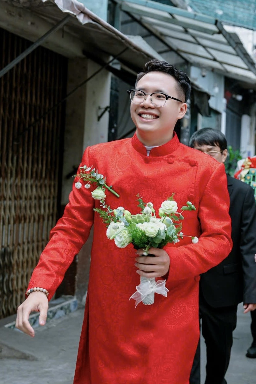 + Áo dài Couple Dâu – Rể tone sur tone hoặc Áo dài cặp đôi lệch tông gắn kết bằng họa tiết thêu tay tinh tế.