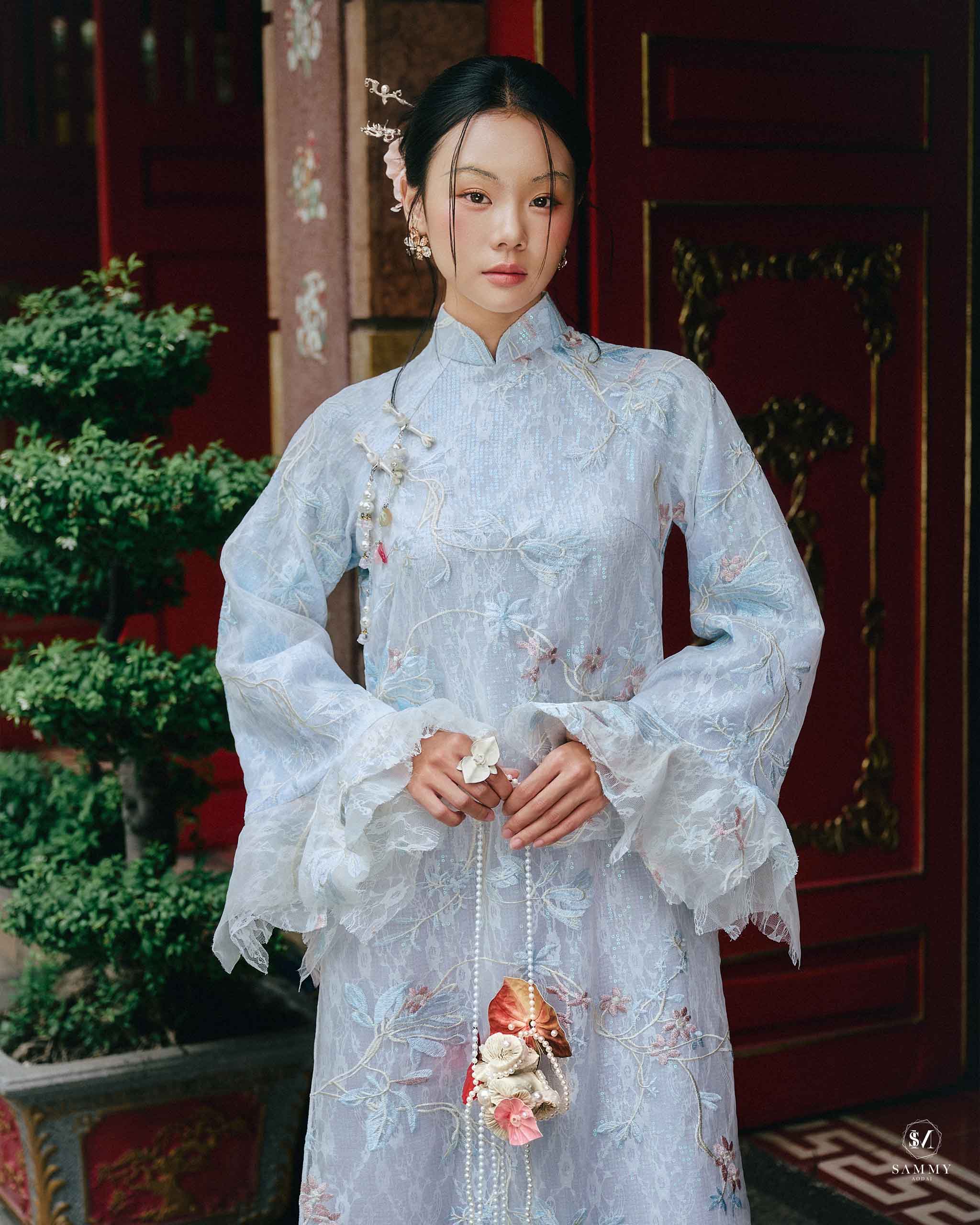 Nguồn cảm hứng của Áo dài Sammy đến từ những biểu tượng tình yêu vượt thời gian (chim công, hoa bướm, cá nước, nghệ thuật điêu khắc …), mềm mại nhưng pha nét quyến rũ của hơi thở đương đại