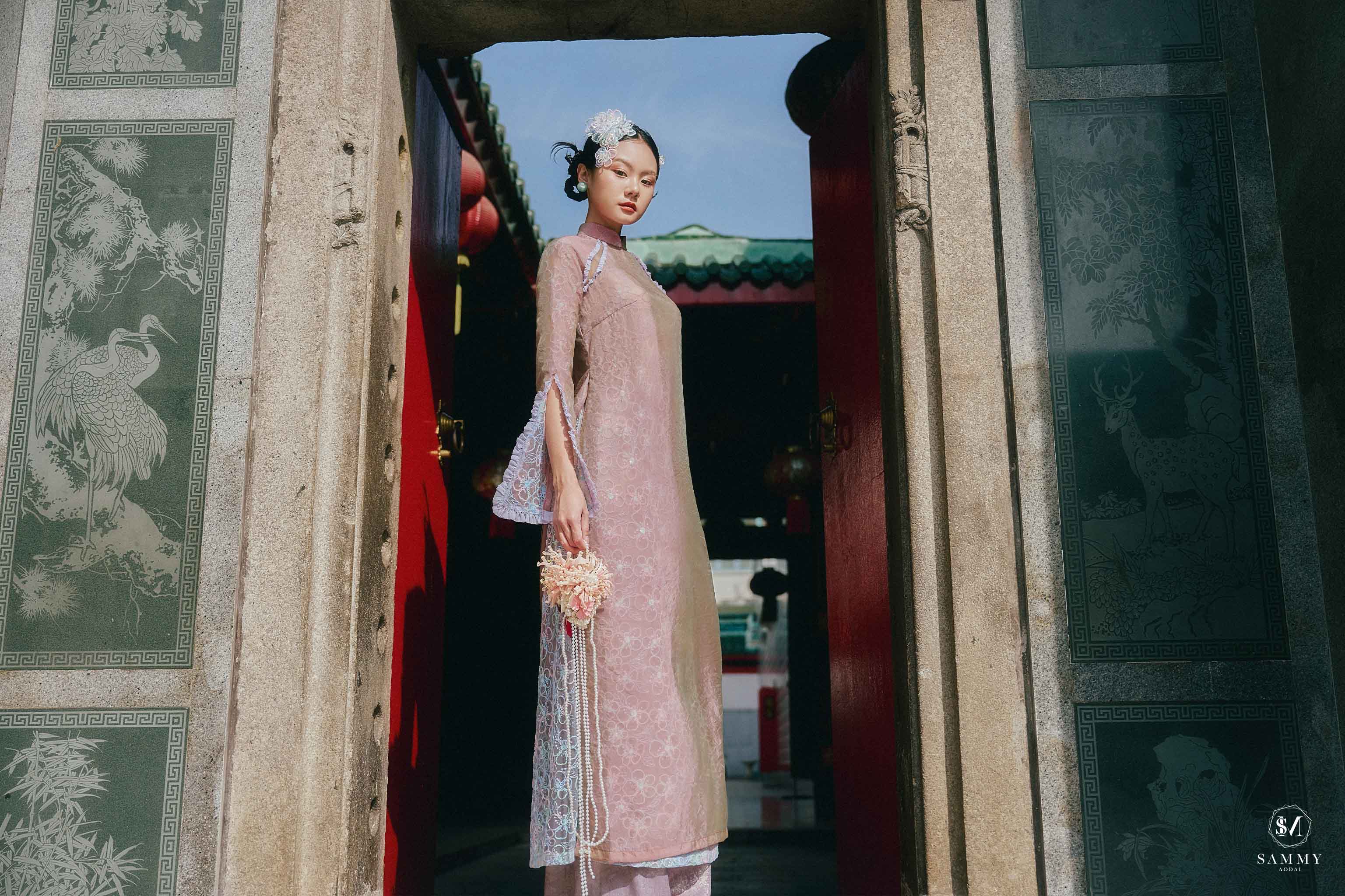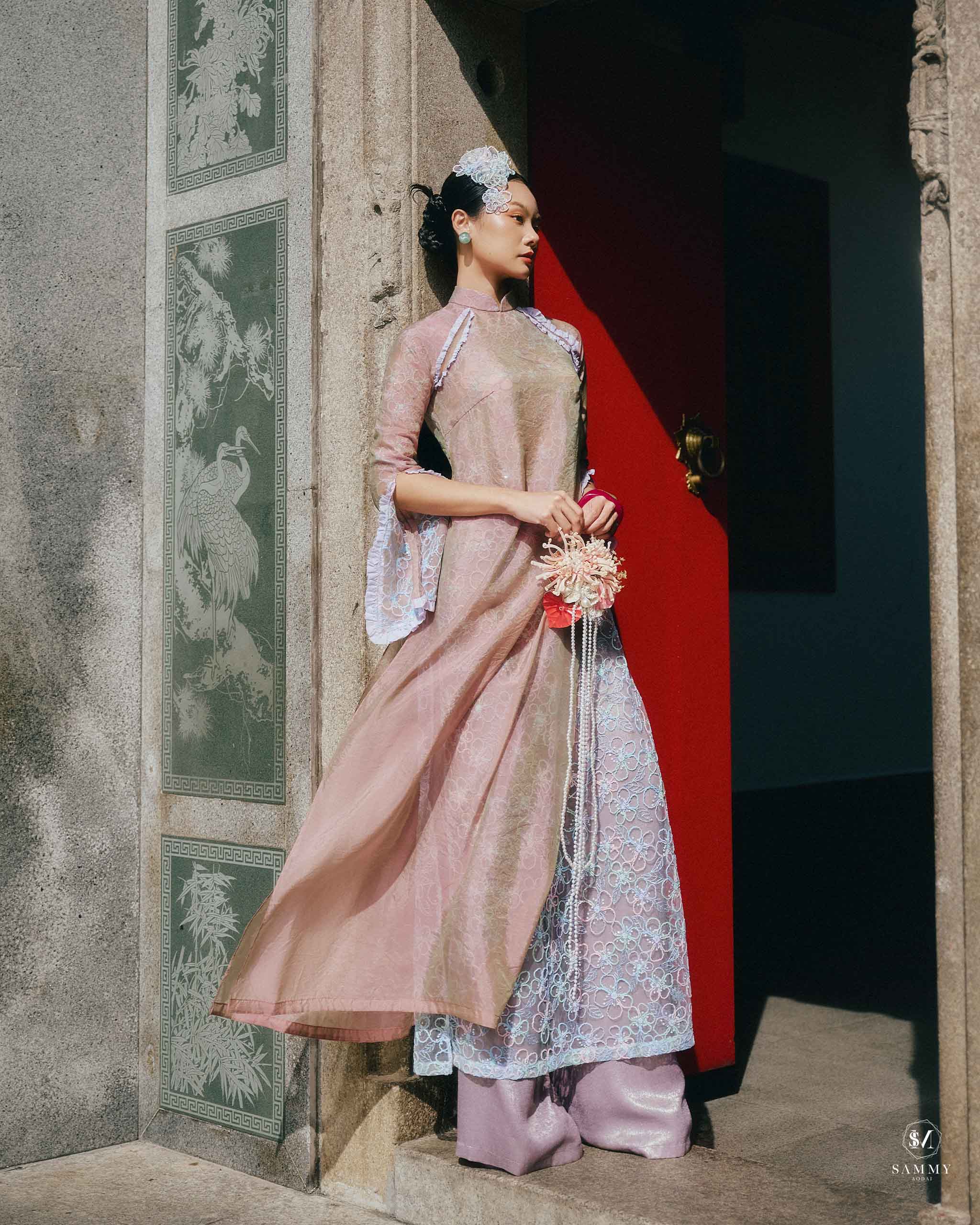 Nguồn cảm hứng của Áo dài Sammy đến từ những biểu tượng tình yêu vượt thời gian (chim công, hoa bướm, cá nước, nghệ thuật điêu khắc …), mềm mại nhưng pha nét quyến rũ của hơi thở đương đại