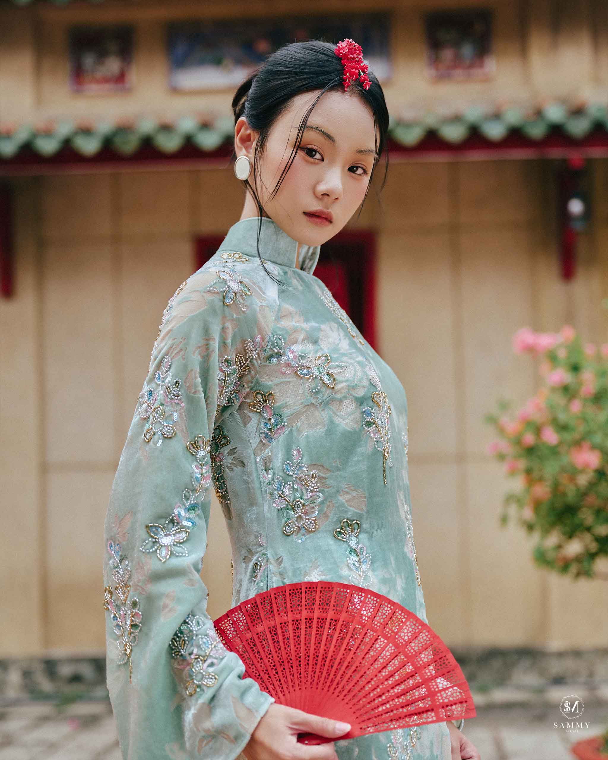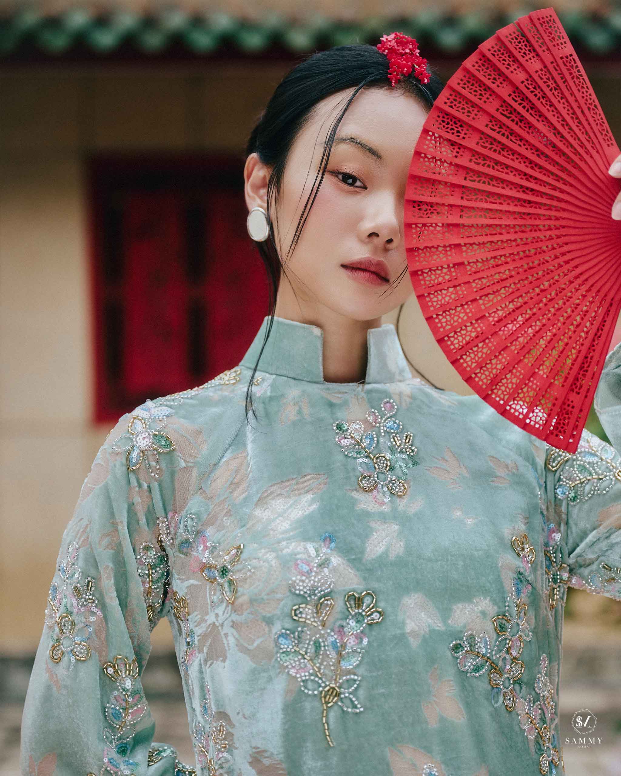 Nguồn cảm hứng của Áo dài Sammy đến từ những biểu tượng tình yêu vượt thời gian (chim công, hoa bướm, cá nước, nghệ thuật điêu khắc …), mềm mại nhưng pha nét quyến rũ của hơi thở đương đại