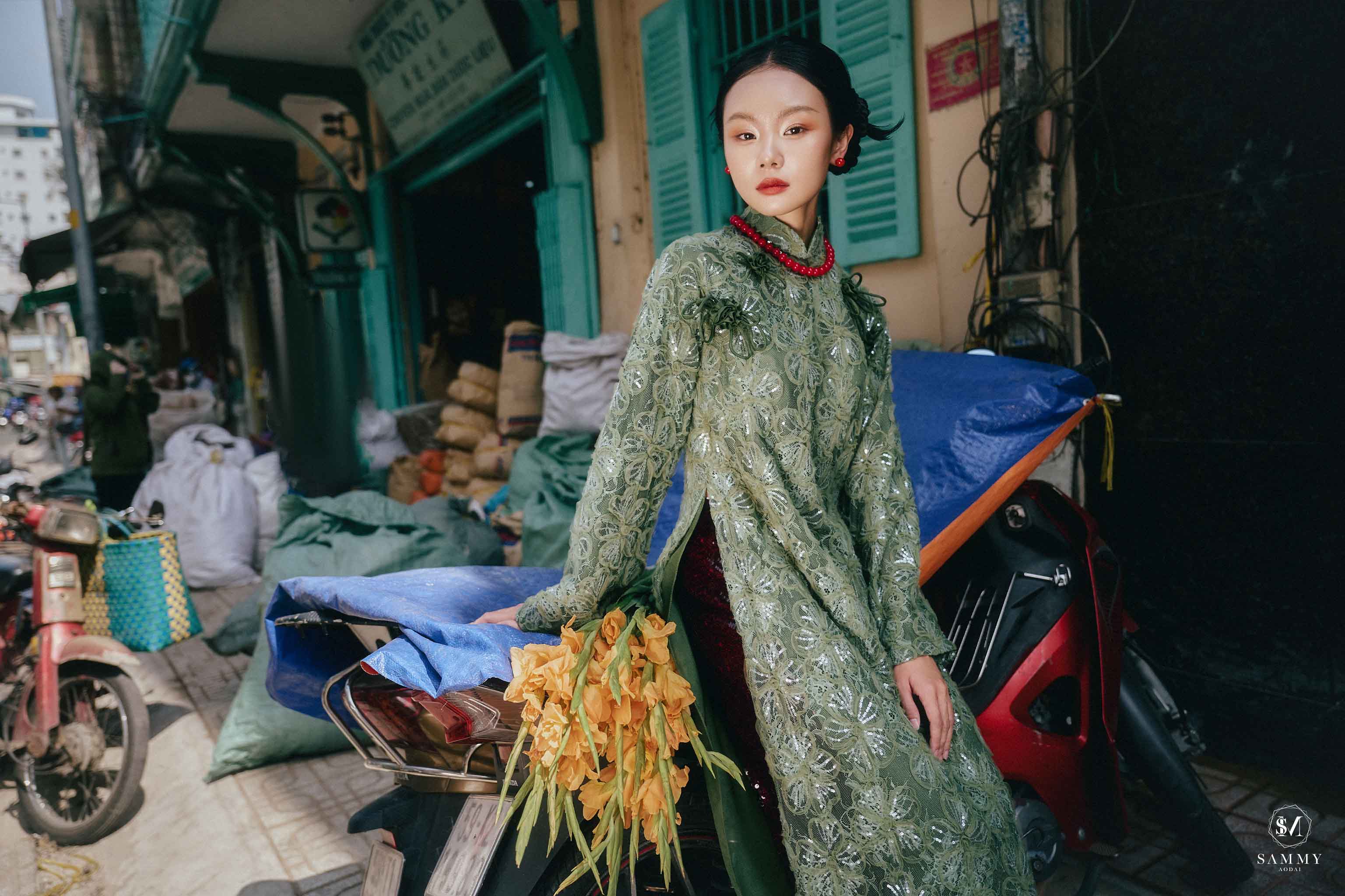 Nguồn cảm hứng của Áo dài Sammy đến từ những biểu tượng tình yêu vượt thời gian (chim công, hoa bướm, cá nước, nghệ thuật điêu khắc …), mềm mại nhưng pha nét quyến rũ của hơi thở đương đại