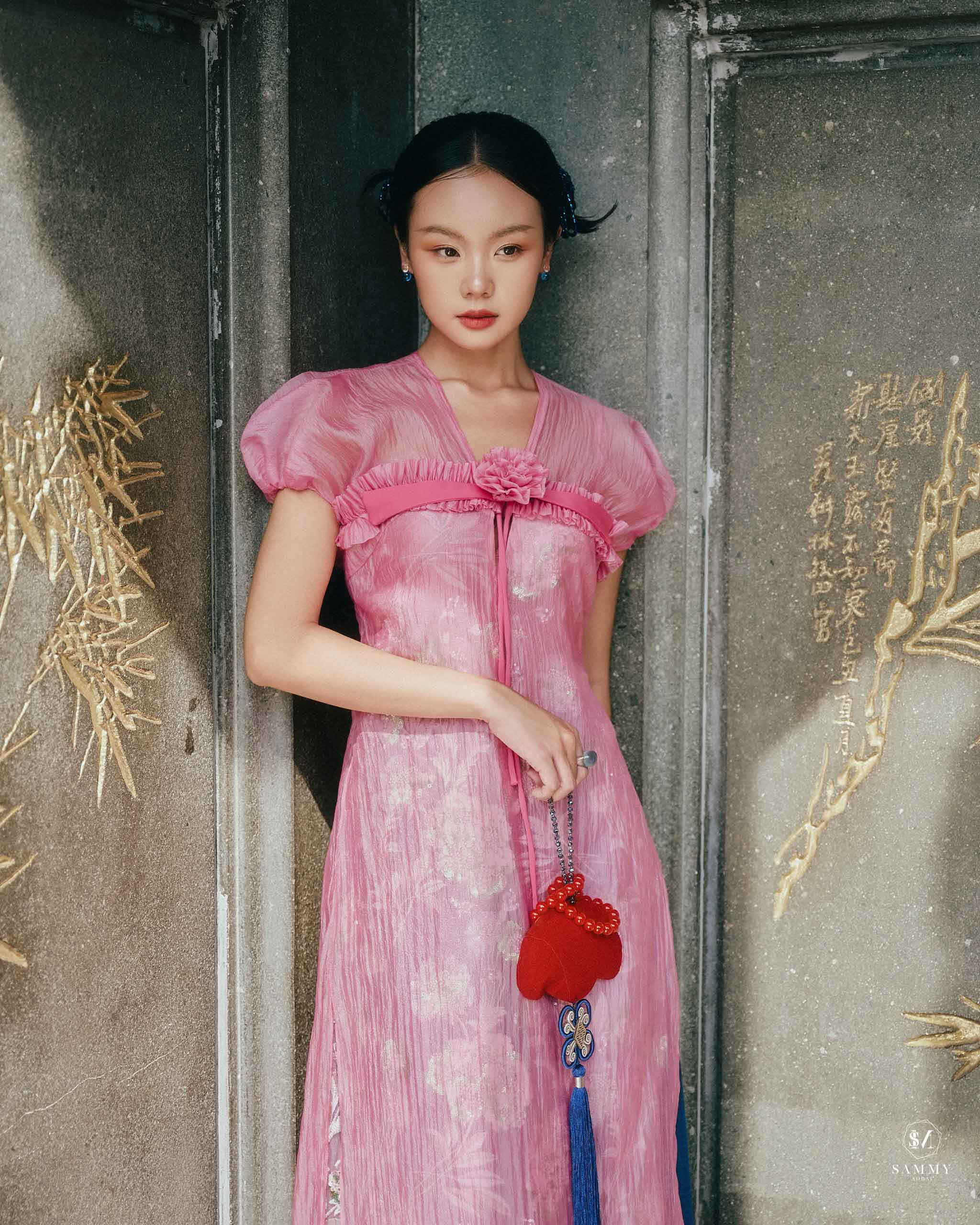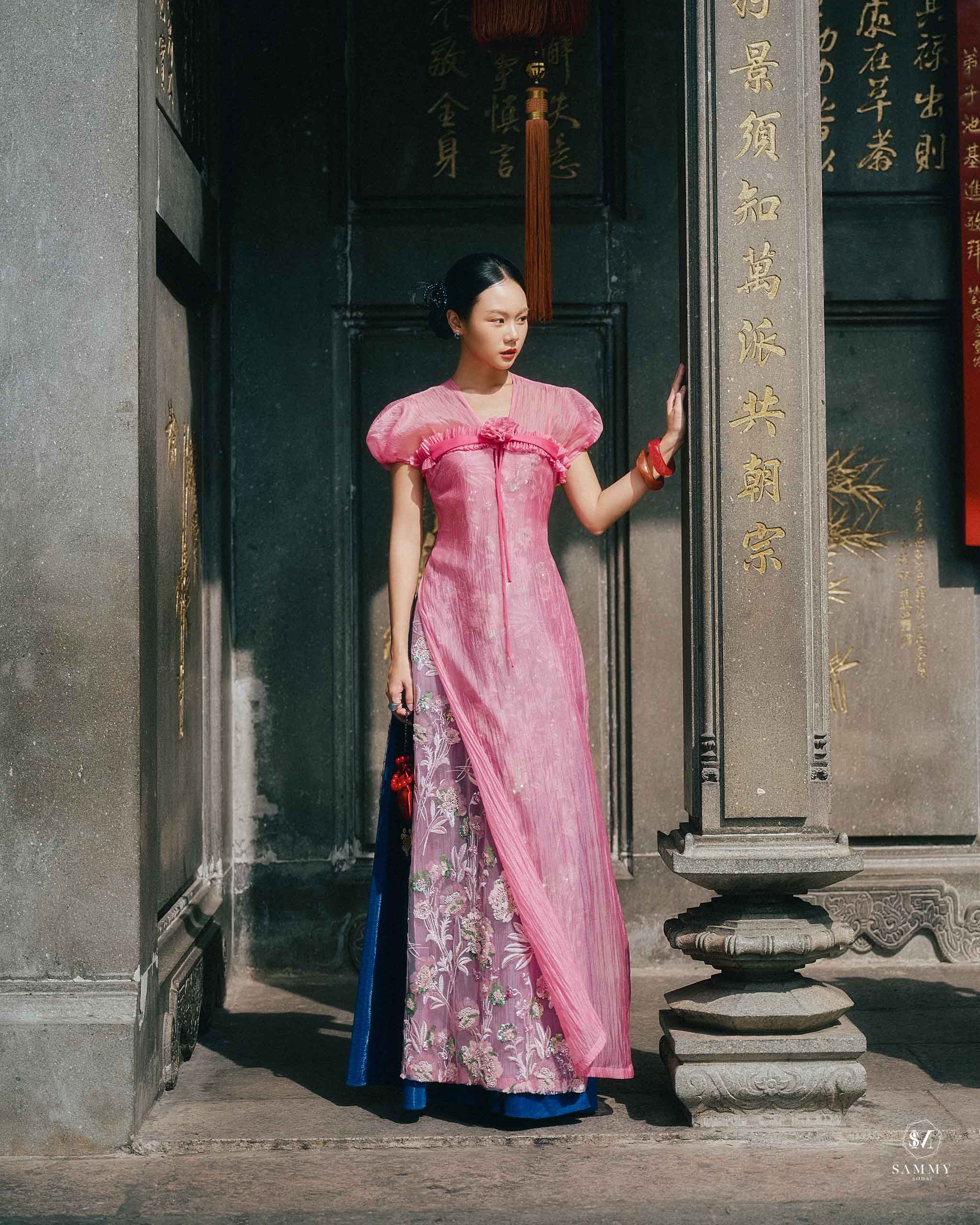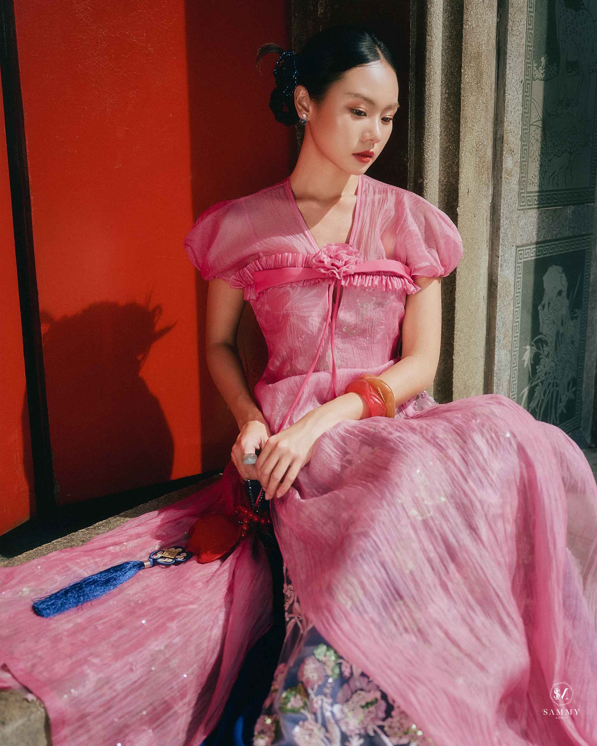 Nguồn cảm hứng của Áo dài Sammy đến từ những biểu tượng tình yêu vượt thời gian (chim công, hoa bướm, cá nước, nghệ thuật điêu khắc …), mềm mại nhưng pha nét quyến rũ của hơi thở đương đại