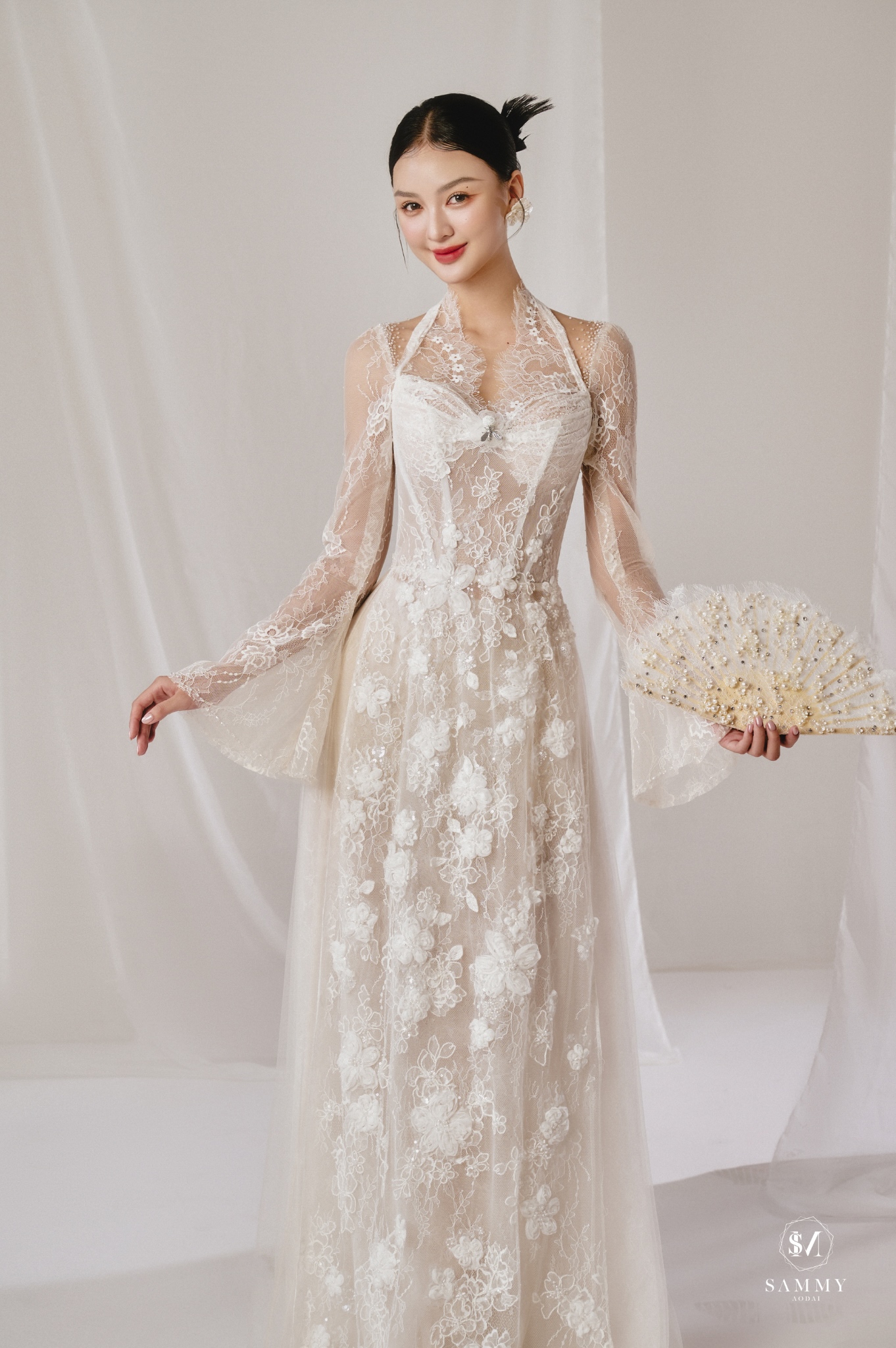 Nguồn cảm hứng của Áo dài Sammy đến từ những biểu tượng tình yêu vượt thời gian (chim công, hoa bướm, cá nước, nghệ thuật điêu khắc …), mềm mại nhưng pha nét quyến rũ của hơi thở đương đại