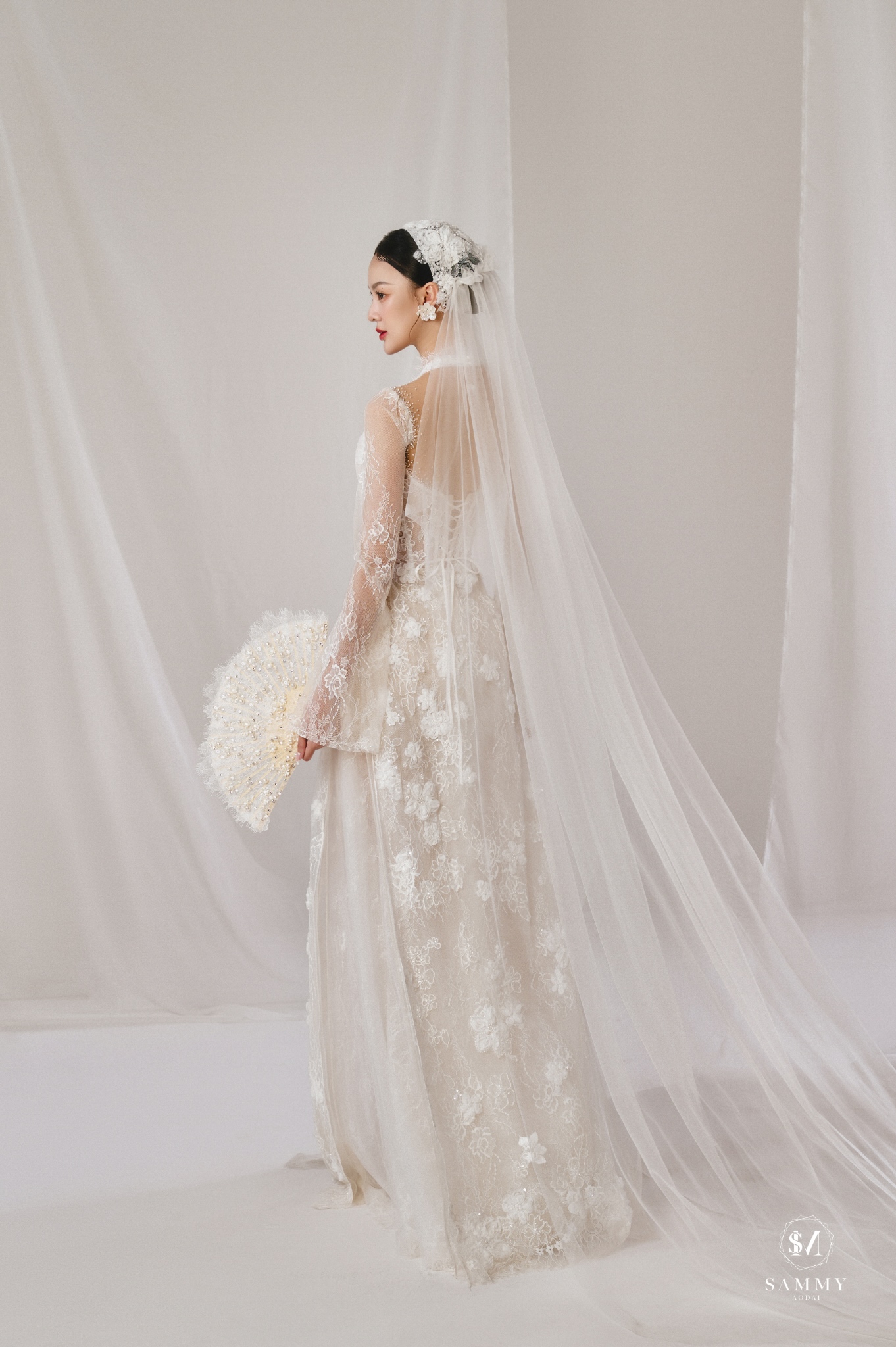 Biến hóa phong cách nàng dâu với thiết kế 2in1 khi diện tà áo dài với thiết kế truyền thống bên trong phối cùng phong cách hoàng gia khi khoác lên chiếc áo choàng rời cách điệu đậm chất Âu trở thành “kim chỉ nam” thiết kế thời trang cưới luôn được các nàng dâu nhà Sammy yêu thích kể từ đầu năm 2023 và tiếp tục trở thành xu hướng.
