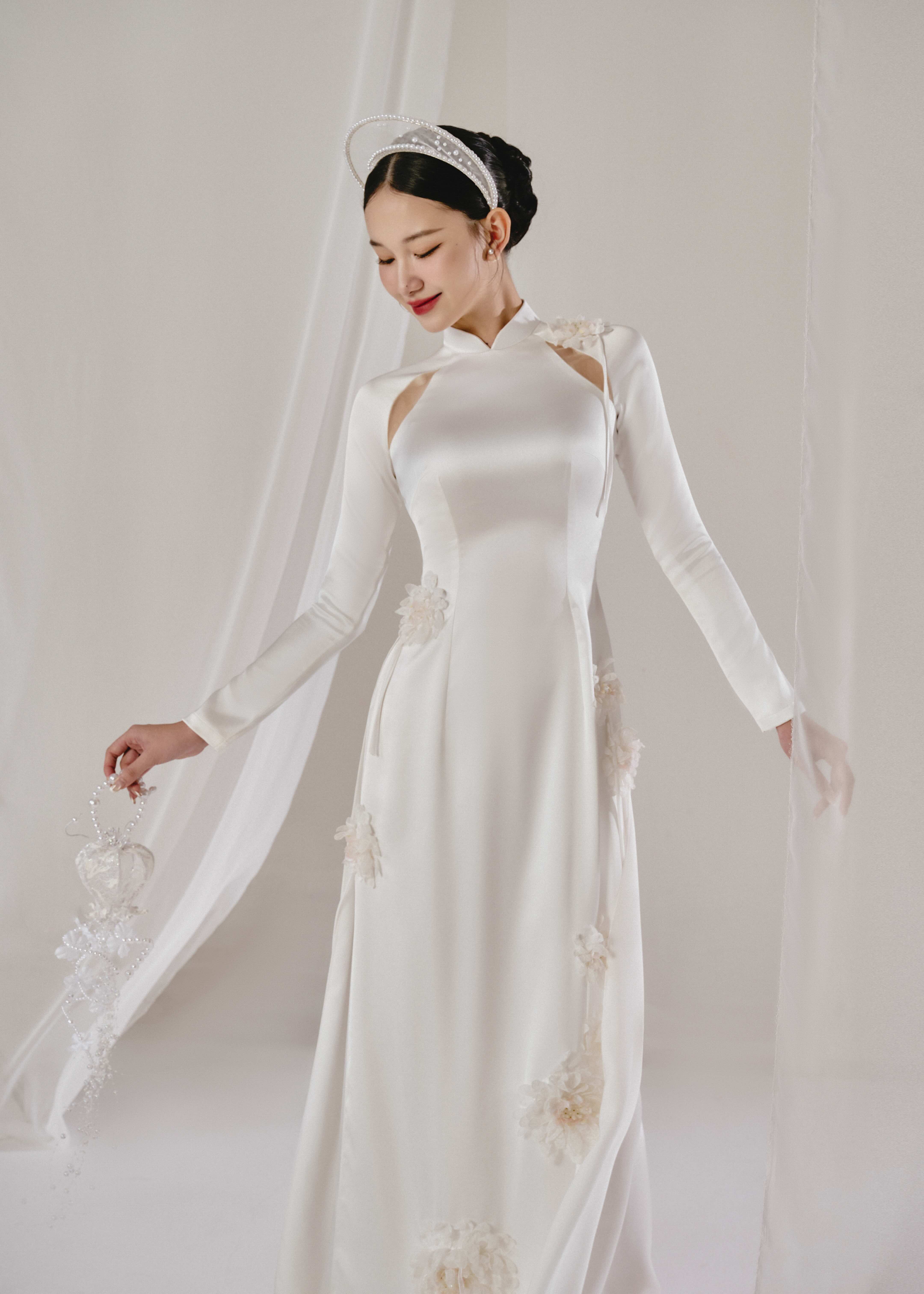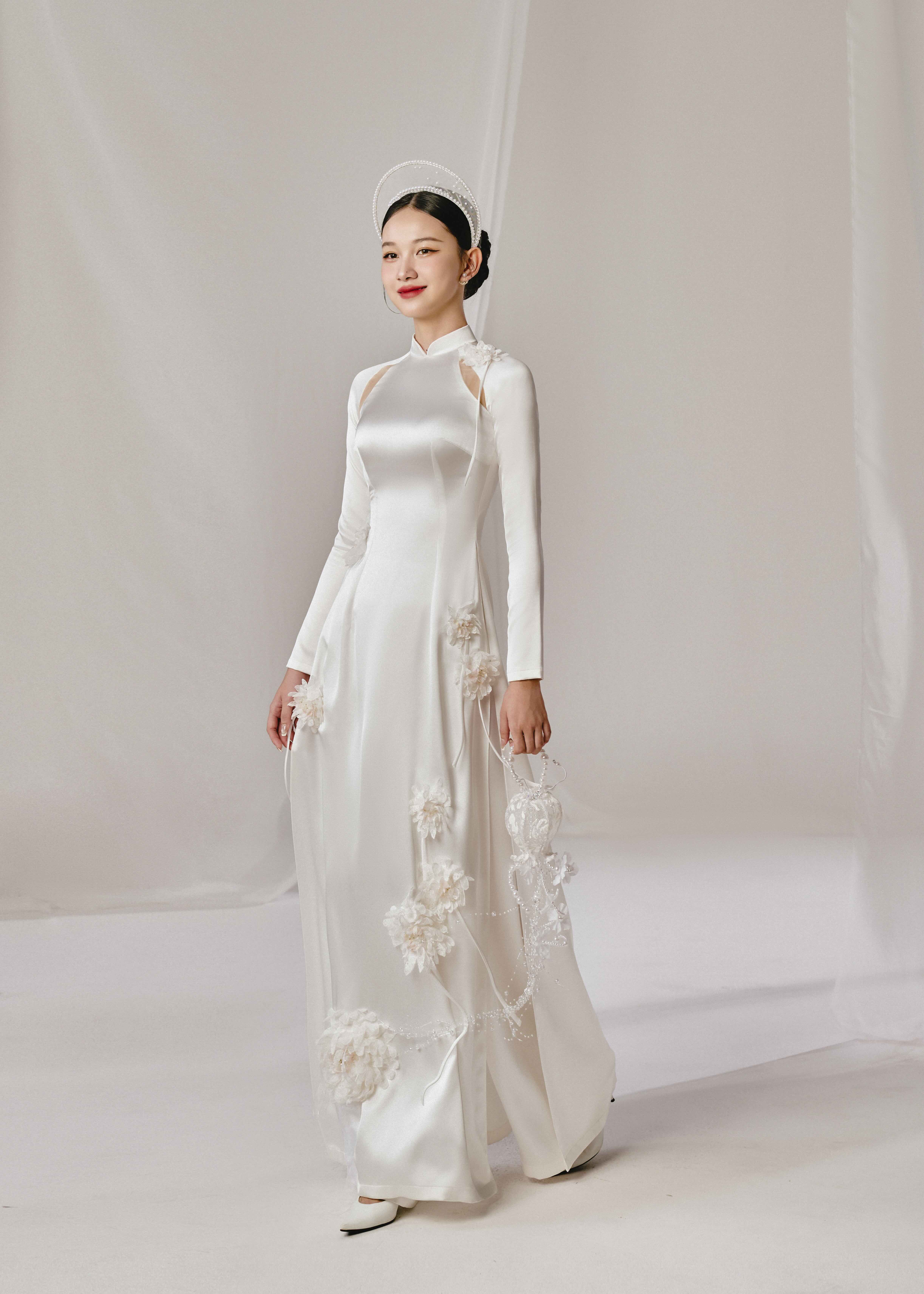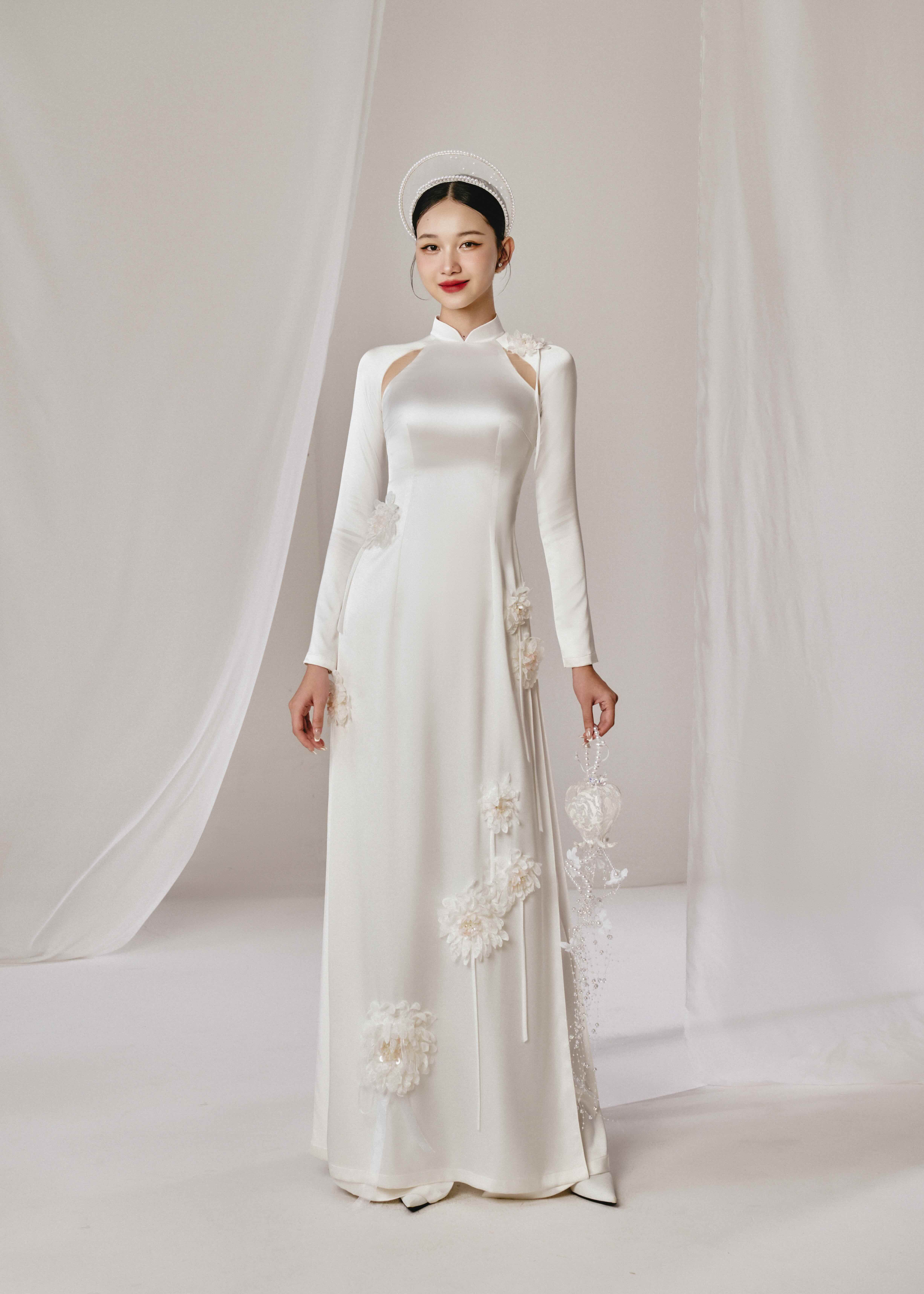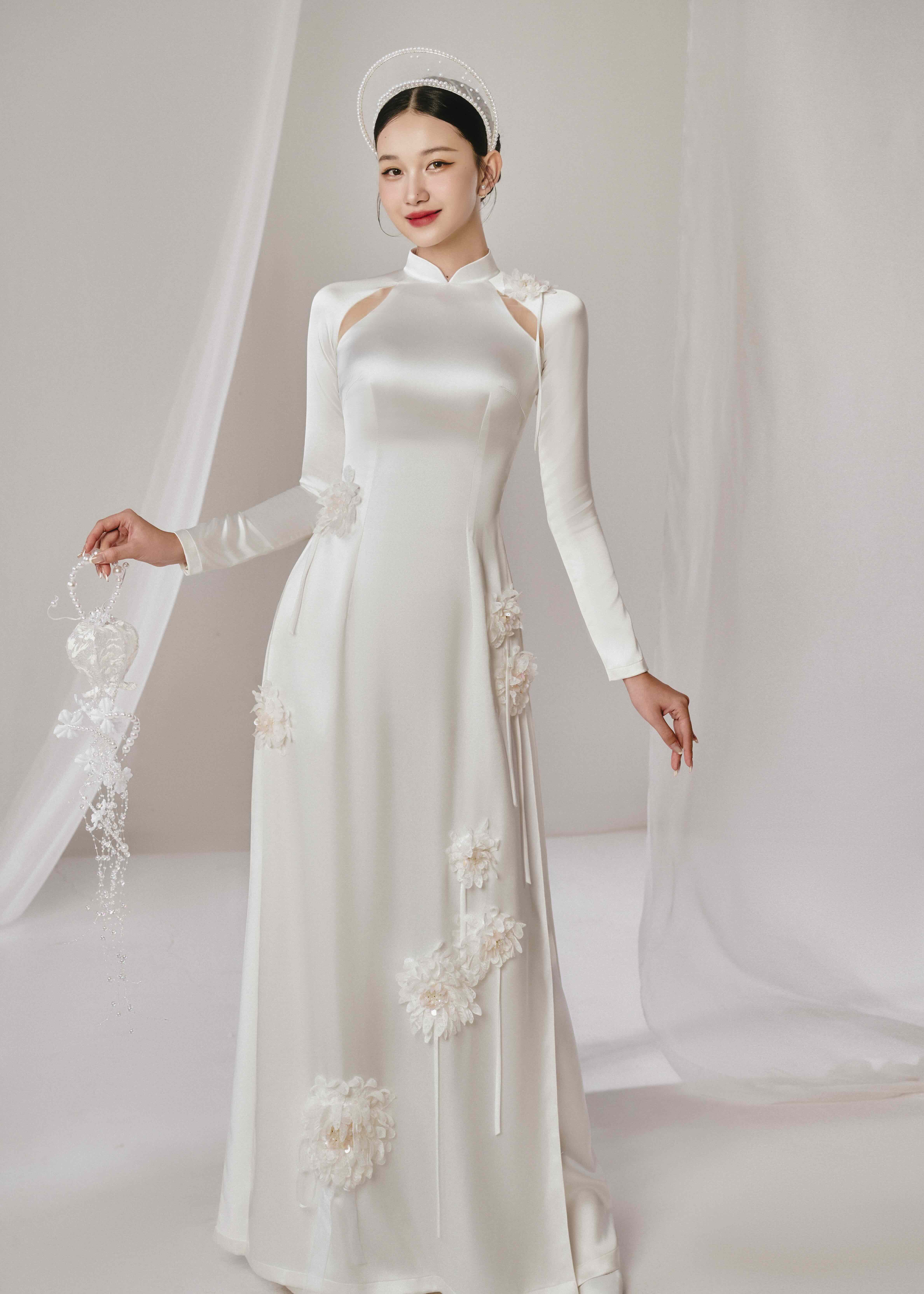 Áo dài được may bằng chất liệu Lụa 2 da cao cấp, có độ co giãn, bóng nhẹ tạo phom áo chuẩn. Thiết kế hoa cúc trắng xử lý bằng chất liệu ren 3D, các cánh hoa được tạo từ nhiều lớp ren phối với nhau.
