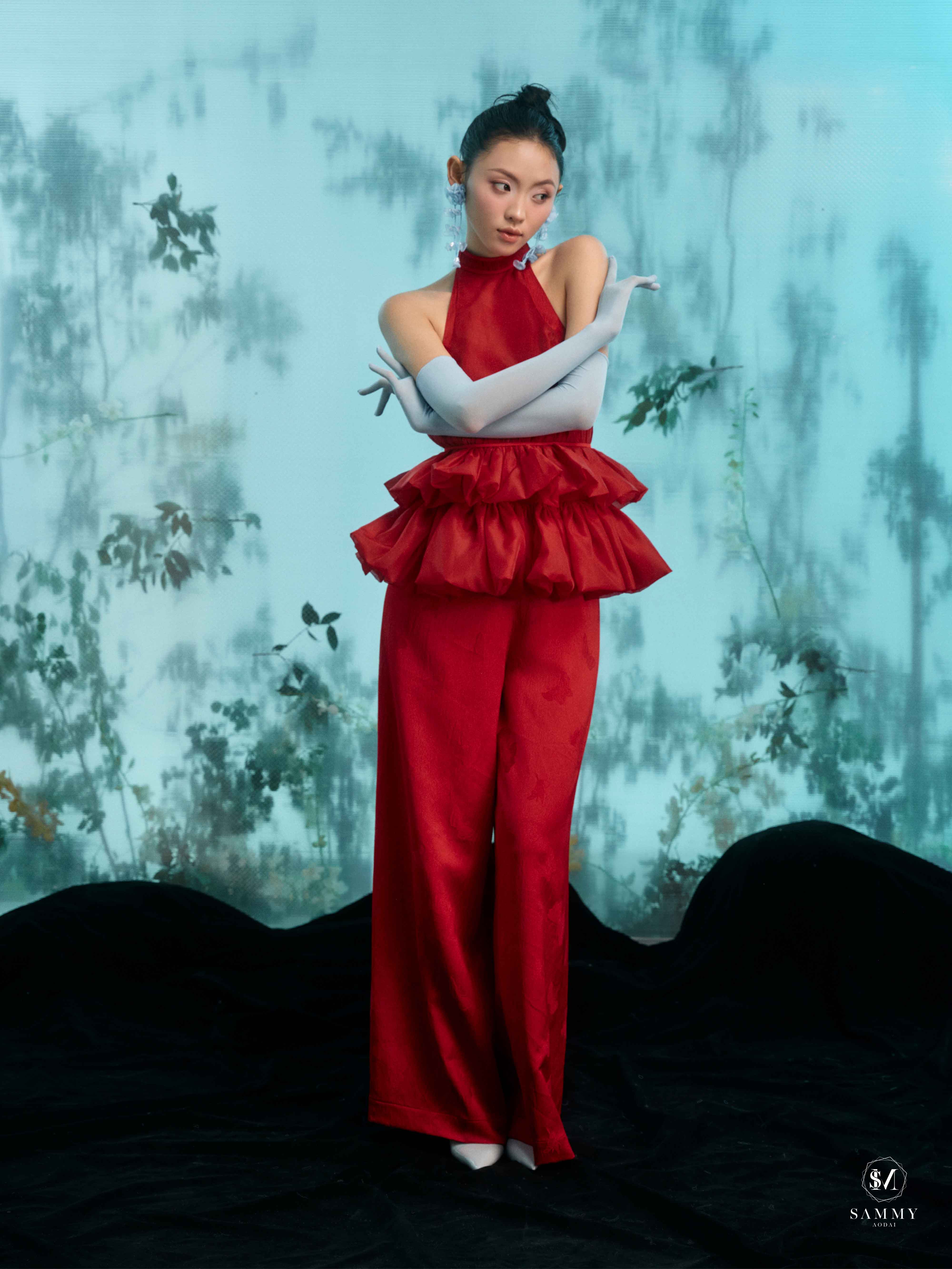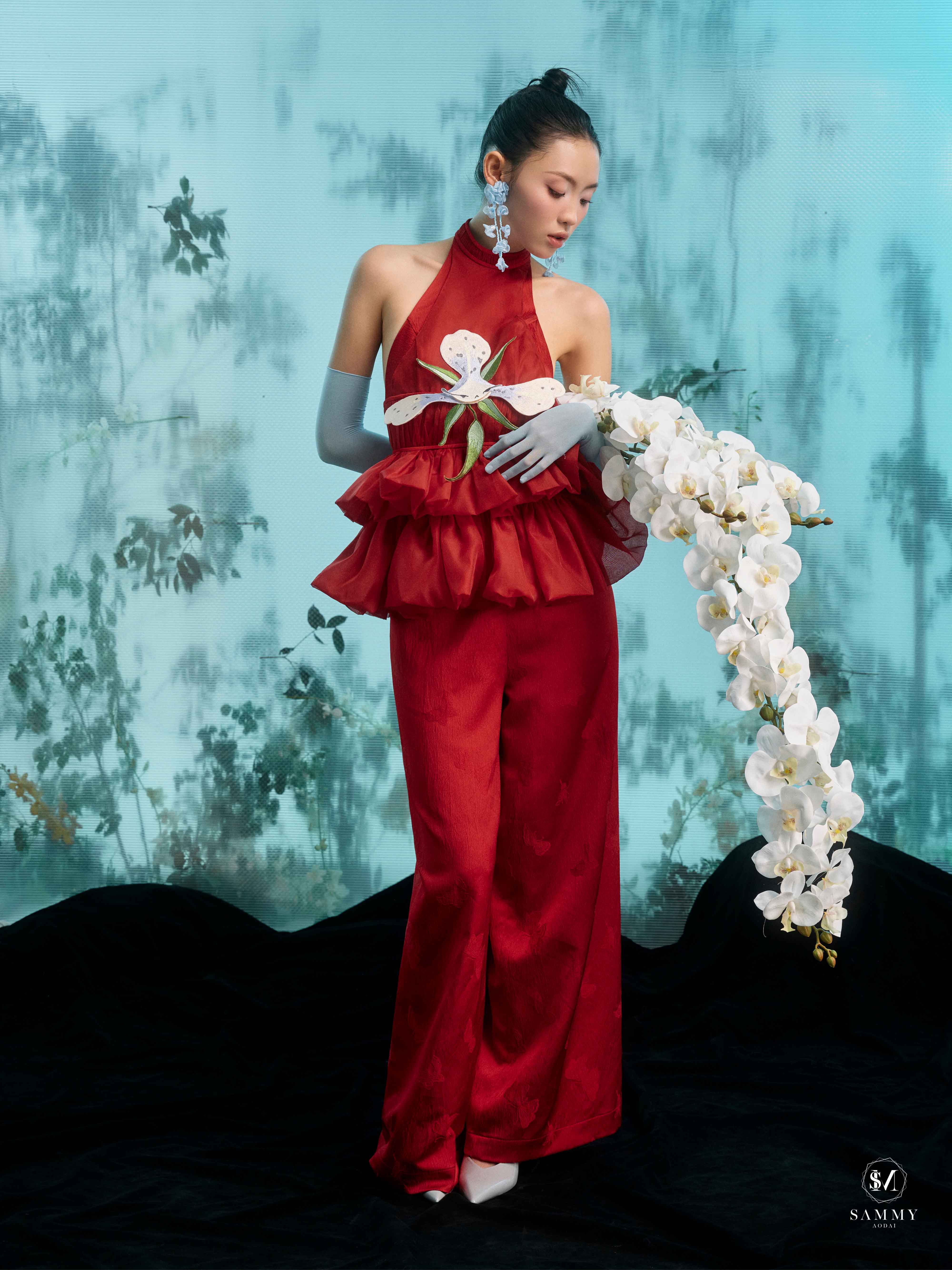 Nguồn cảm hứng của Áo dài Sammy đến từ những biểu tượng tình yêu vượt thời gian (chim công, hoa bướm, cá nước, nghệ thuật điêu khắc …), mềm mại nhưng pha nét quyến rũ của hơi thở đương đại