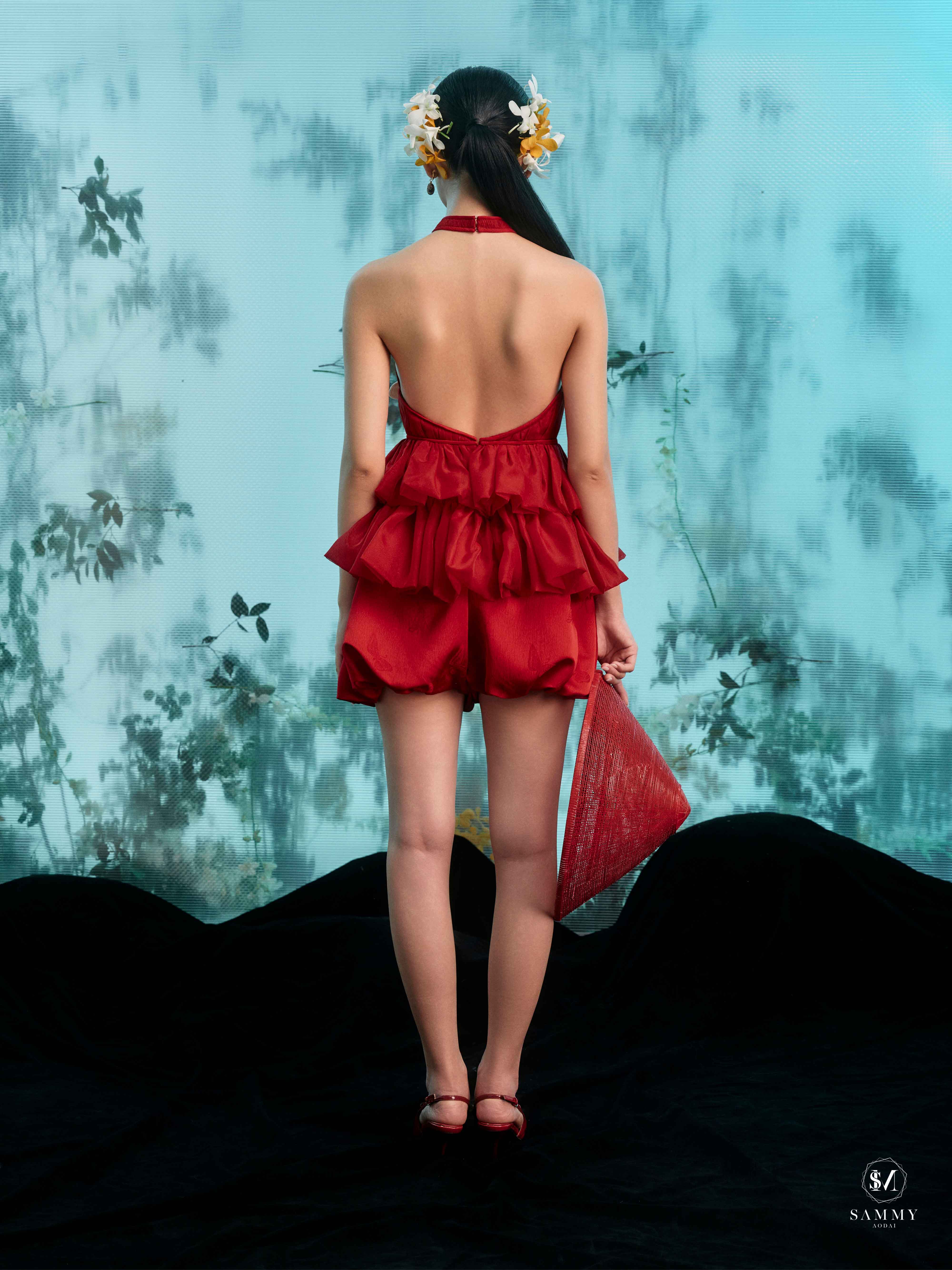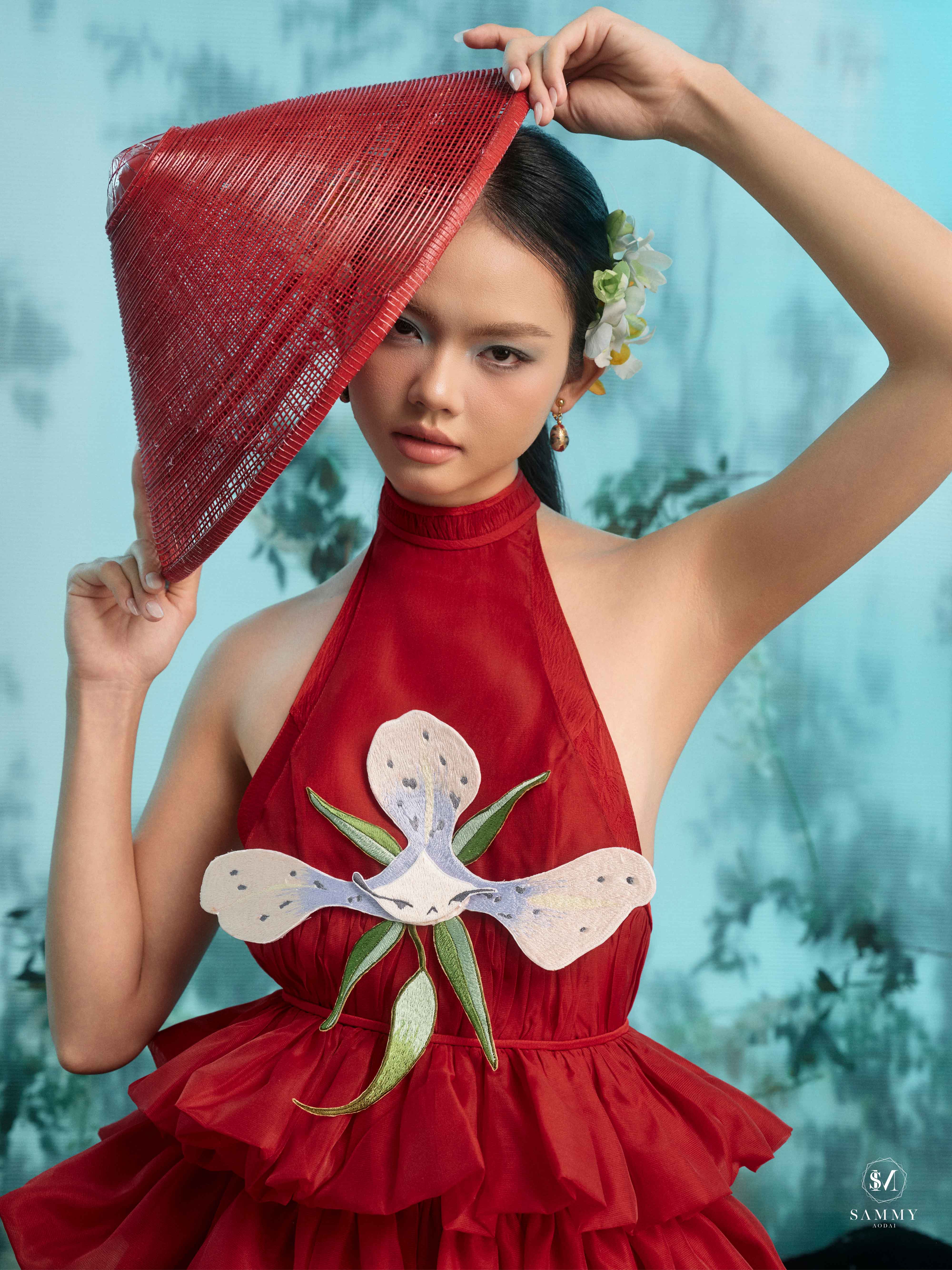 Nguồn cảm hứng của Áo dài Sammy đến từ những biểu tượng tình yêu vượt thời gian (chim công, hoa bướm, cá nước, nghệ thuật điêu khắc …), mềm mại nhưng pha nét quyến rũ của hơi thở đương đại