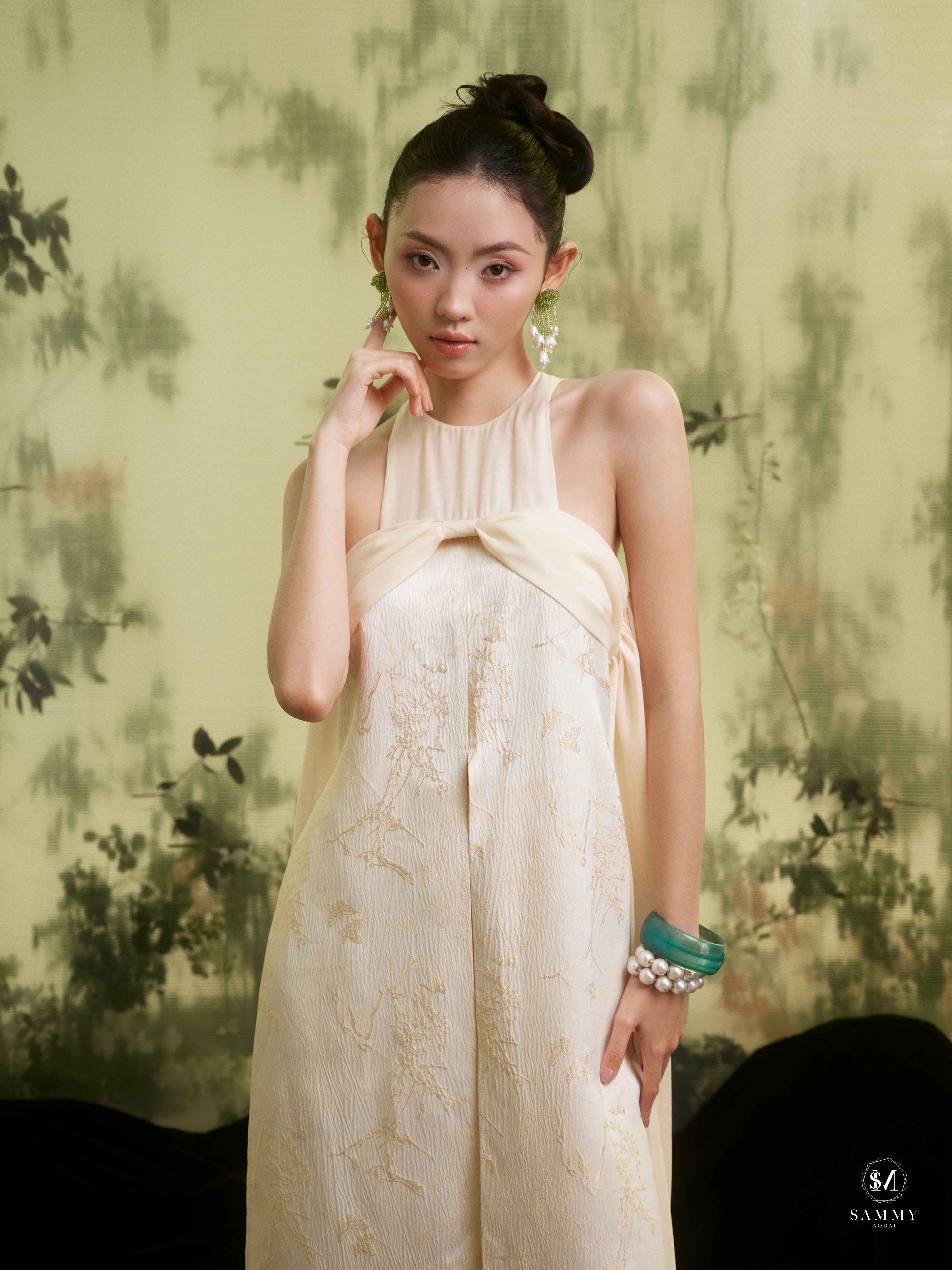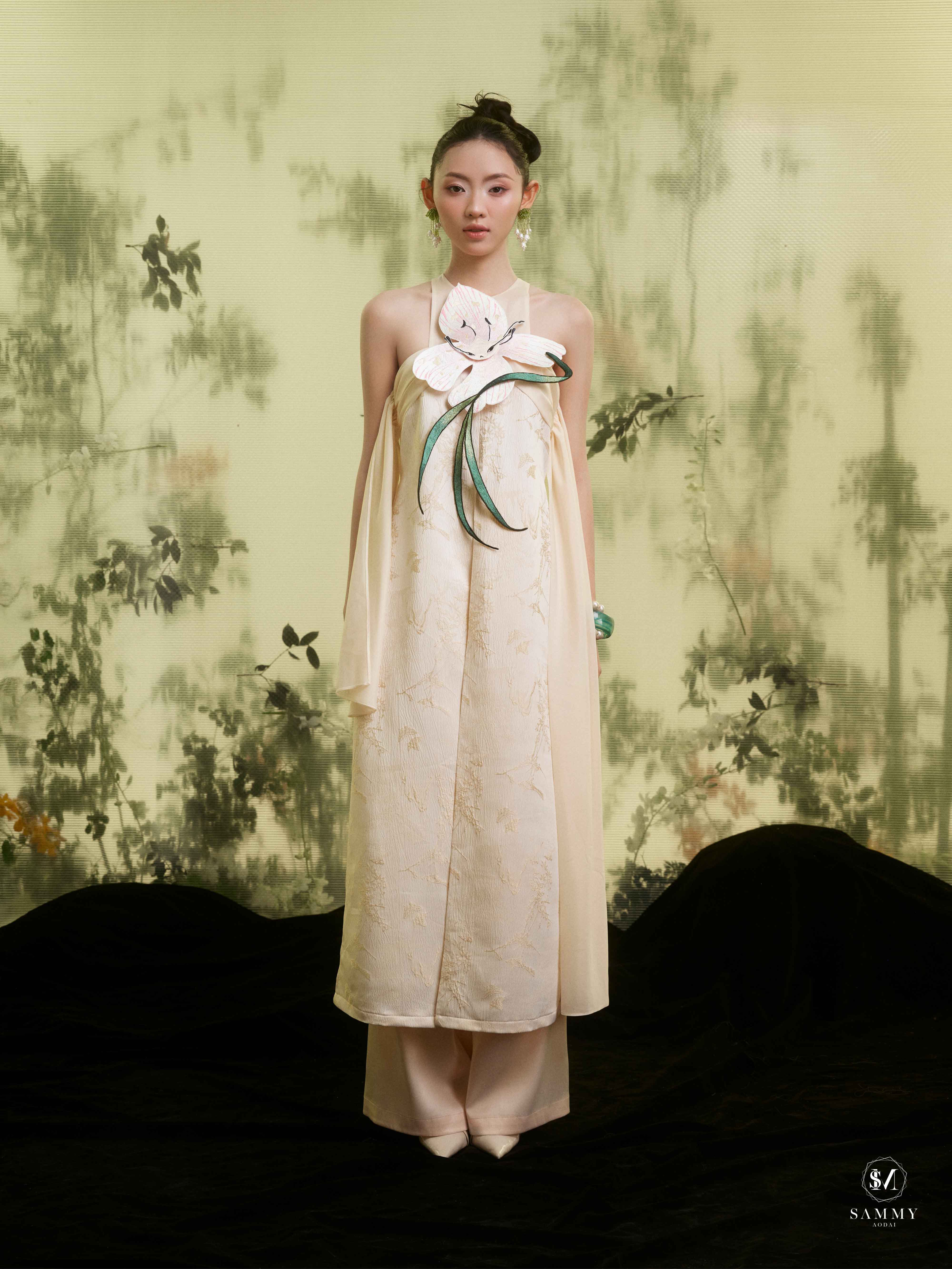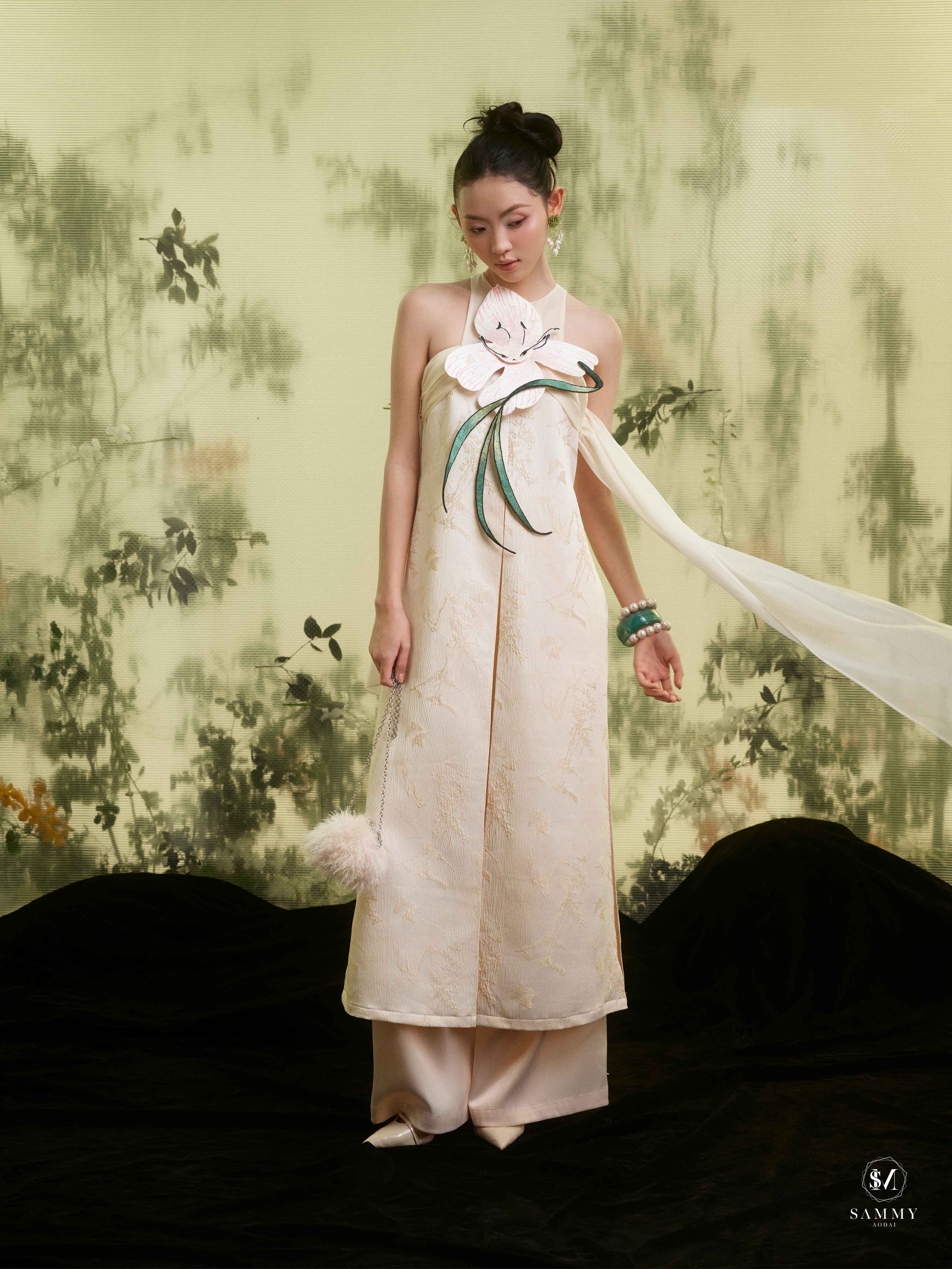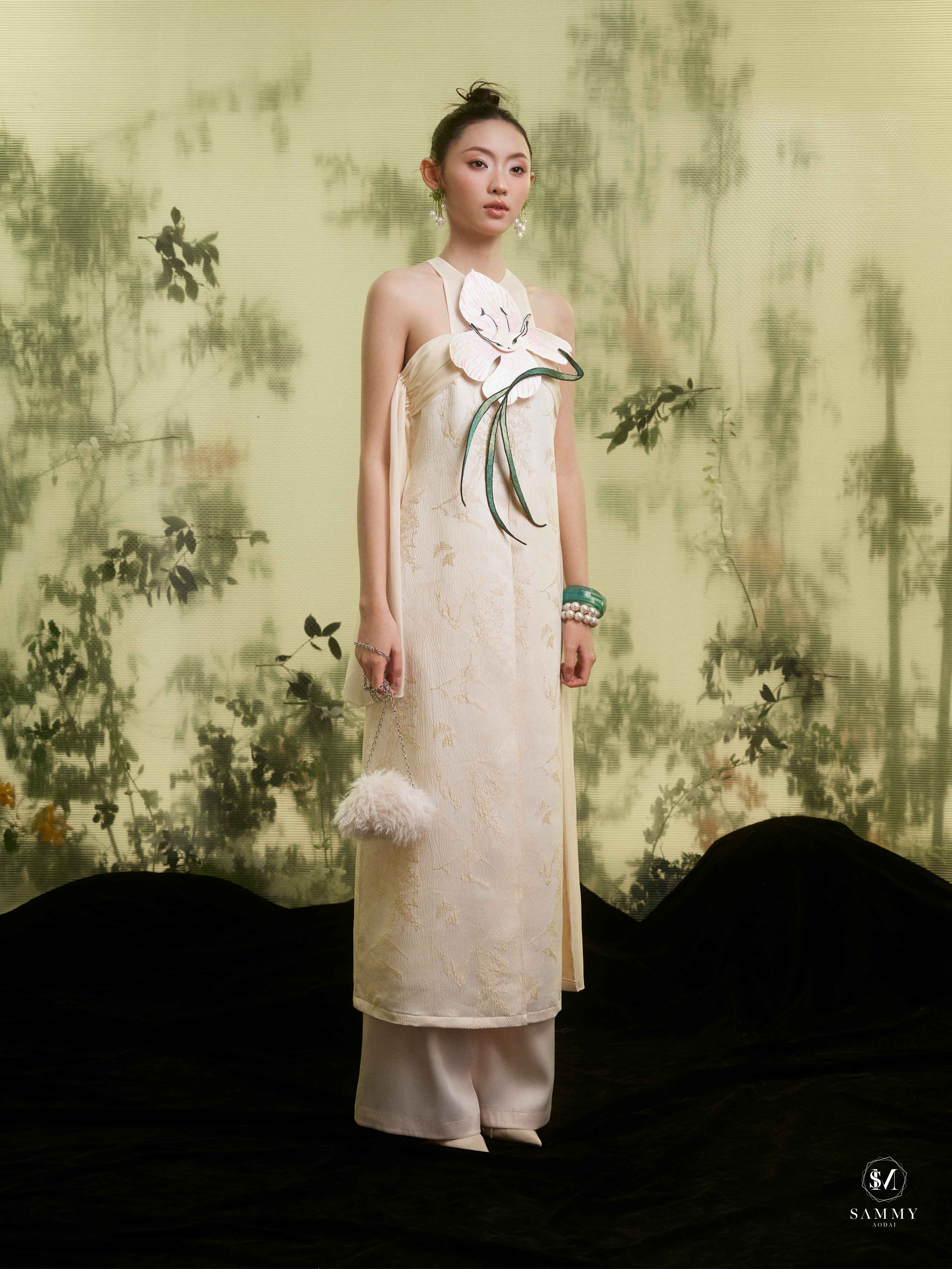 Nguồn cảm hứng của Áo dài Sammy đến từ những biểu tượng tình yêu vượt thời gian (chim công, hoa bướm, cá nước, nghệ thuật điêu khắc …), mềm mại nhưng pha nét quyến rũ của hơi thở đương đại