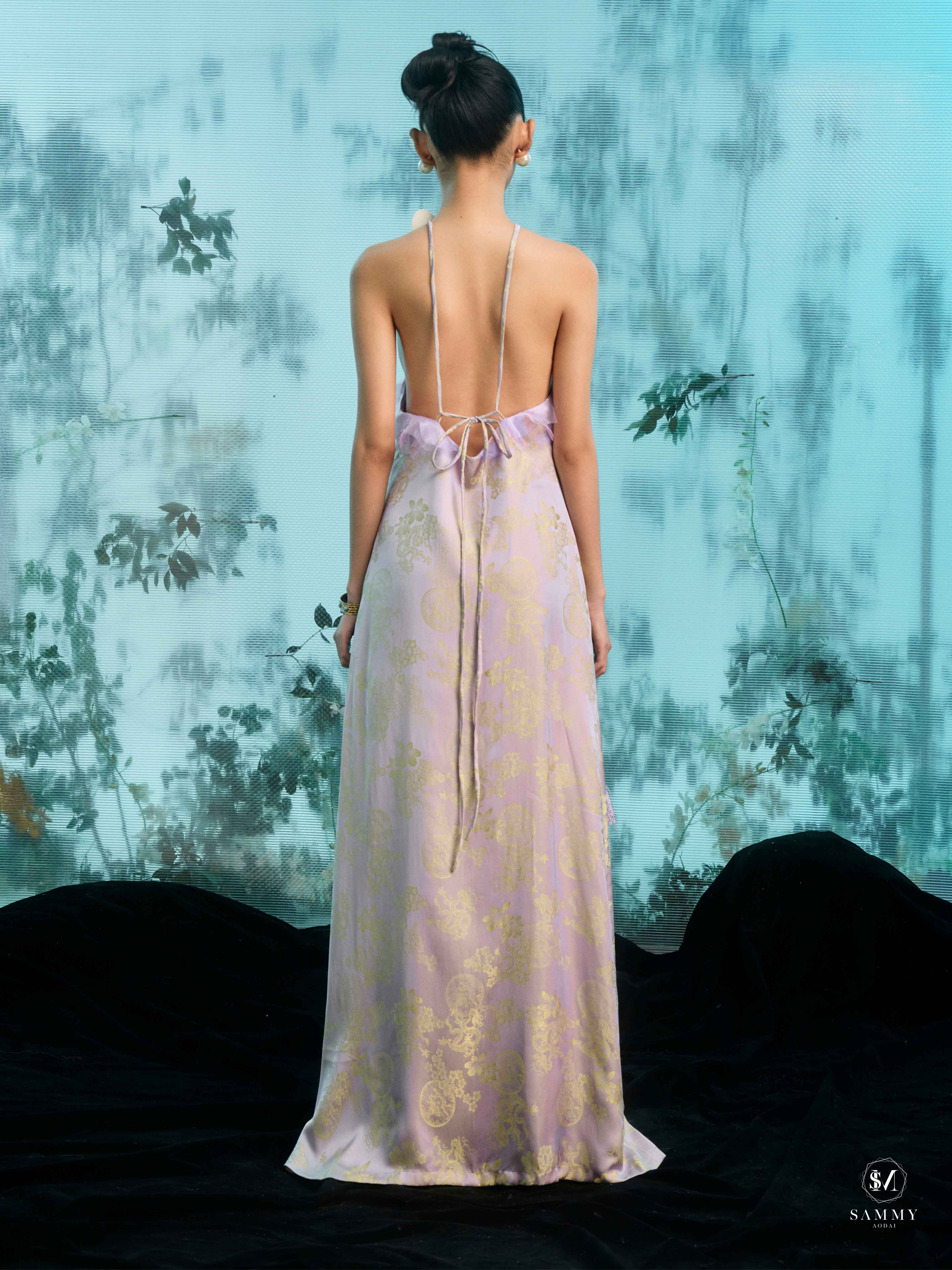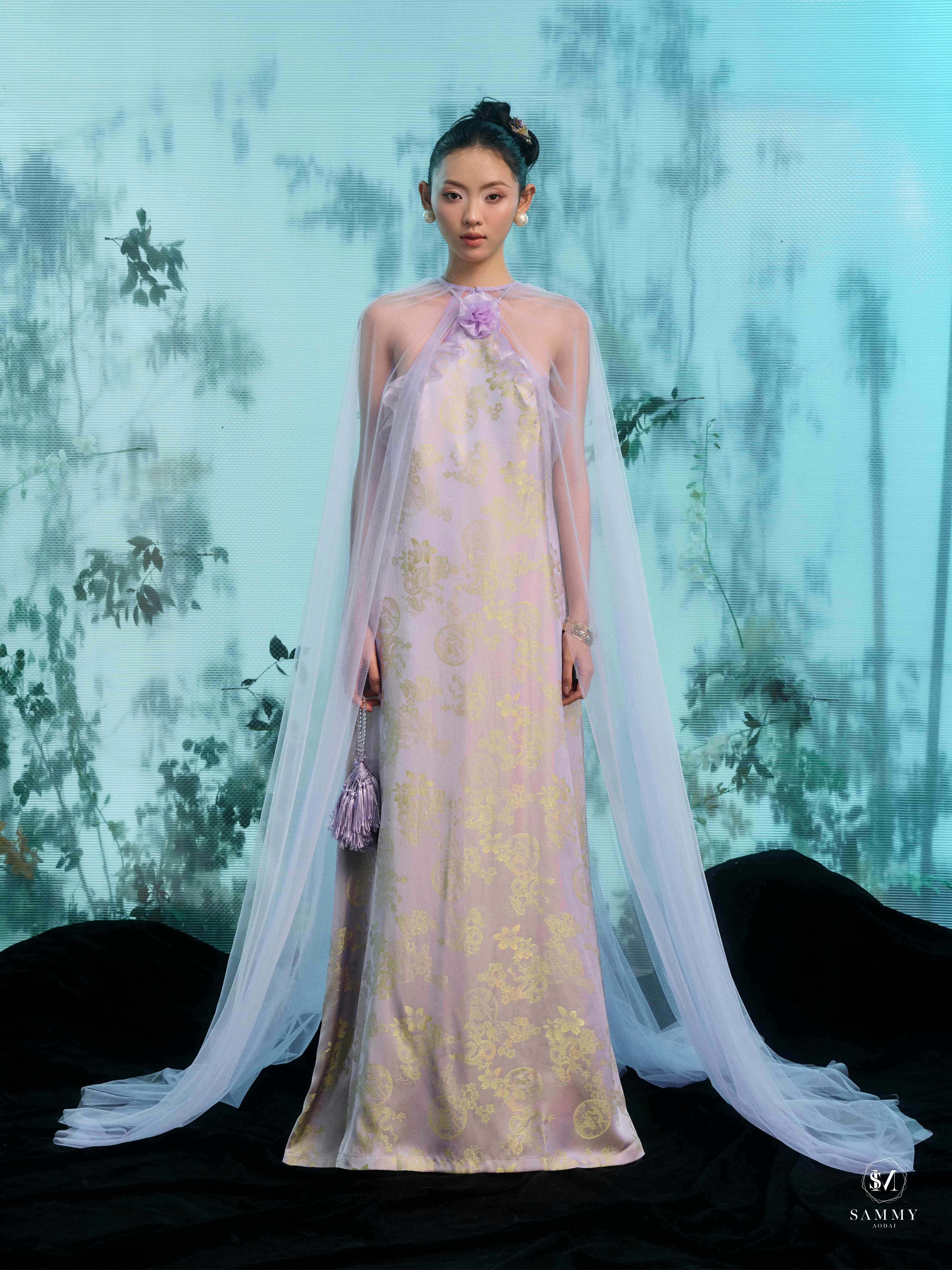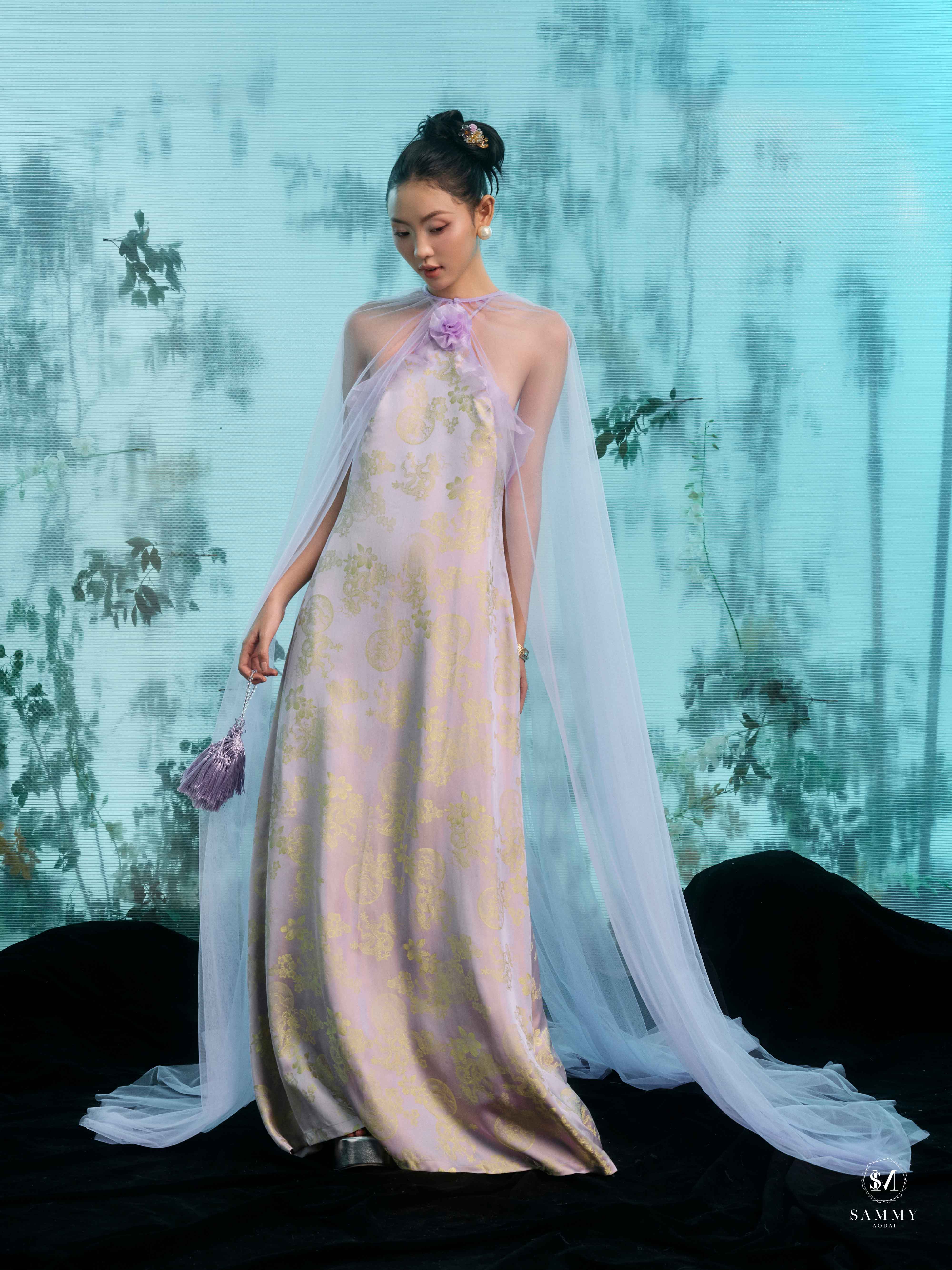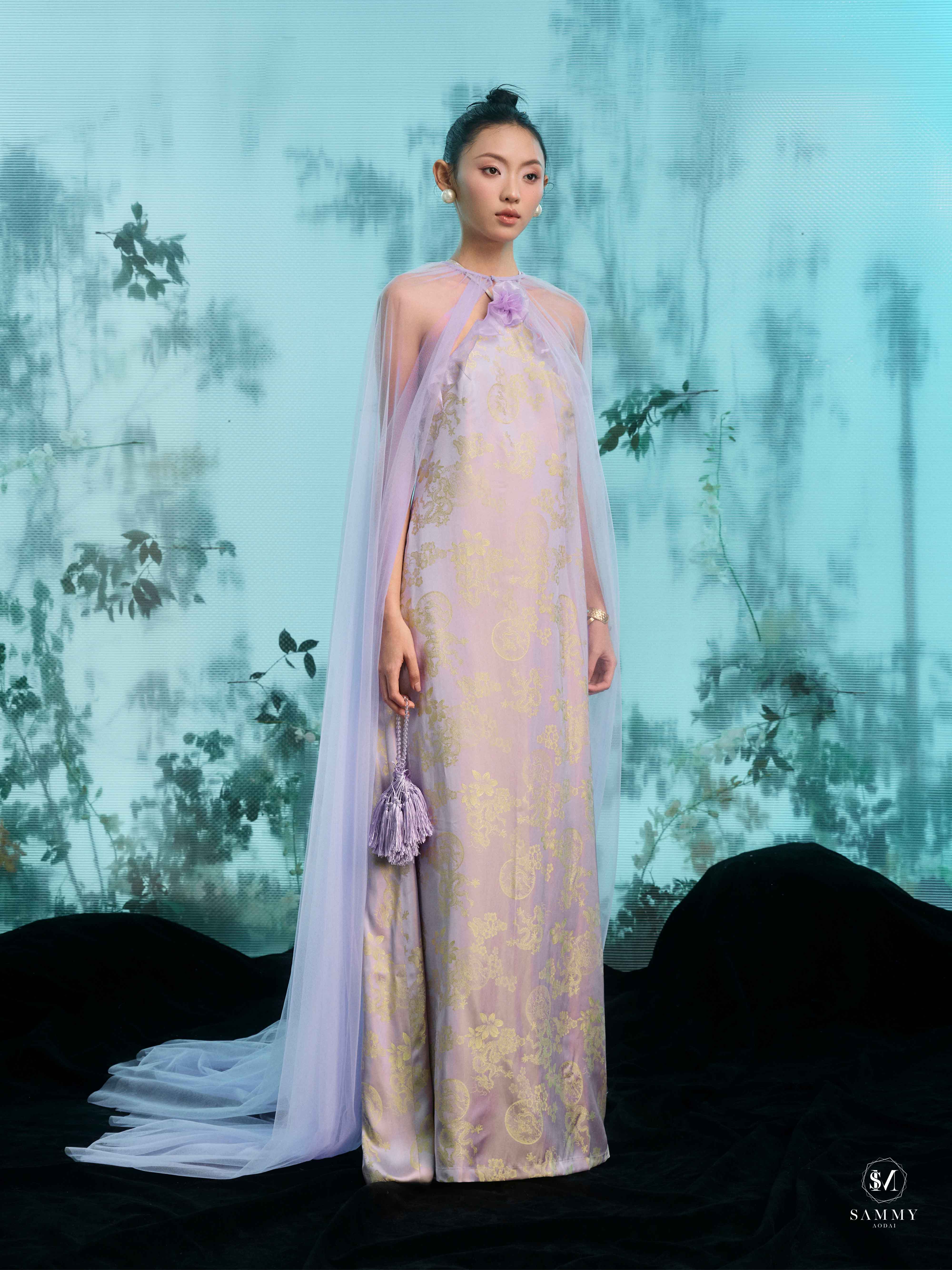 Nguồn cảm hứng của Áo dài Sammy đến từ những biểu tượng tình yêu vượt thời gian (chim công, hoa bướm, cá nước, nghệ thuật điêu khắc …), mềm mại nhưng pha nét quyến rũ của hơi thở đương đại