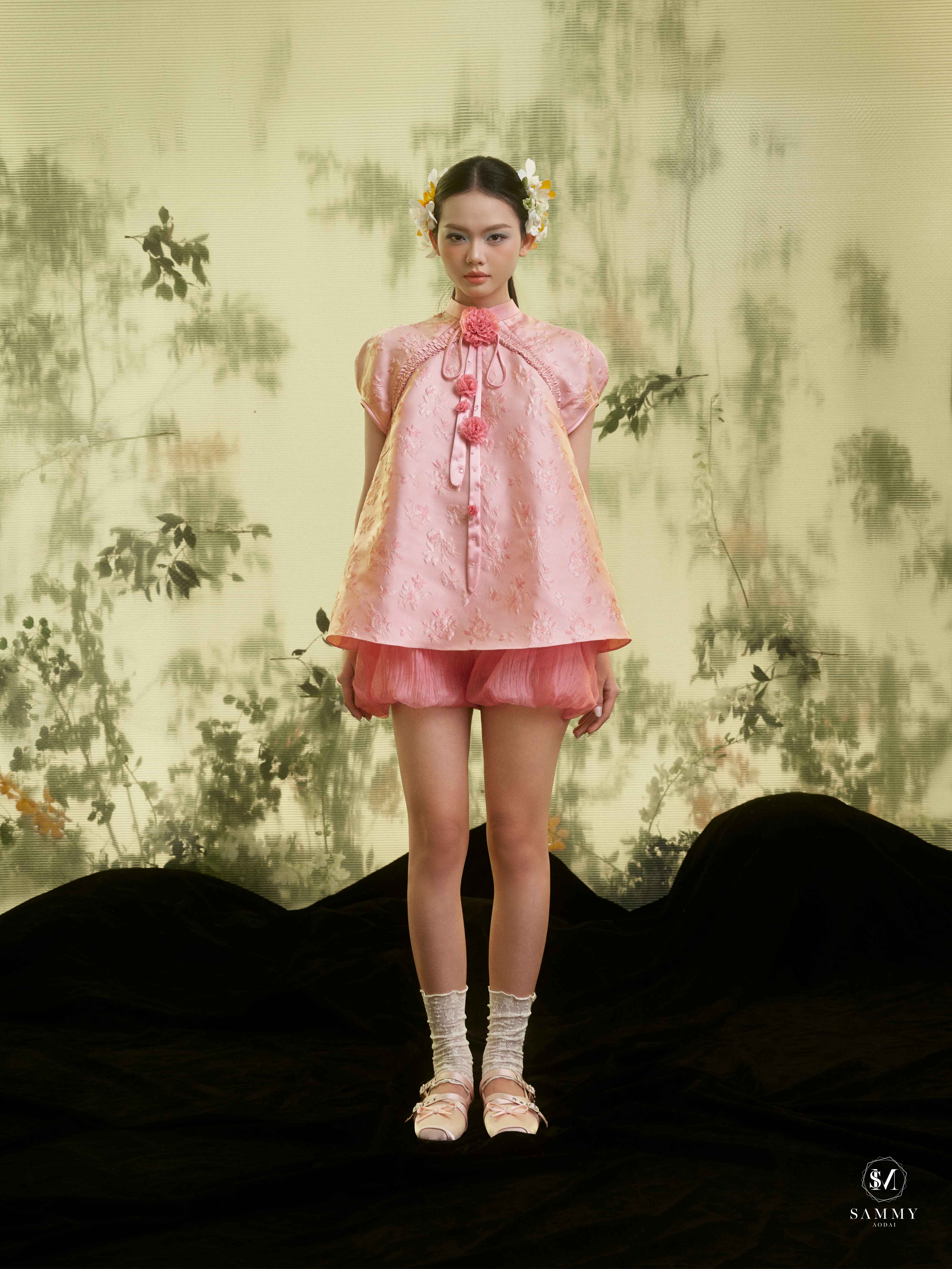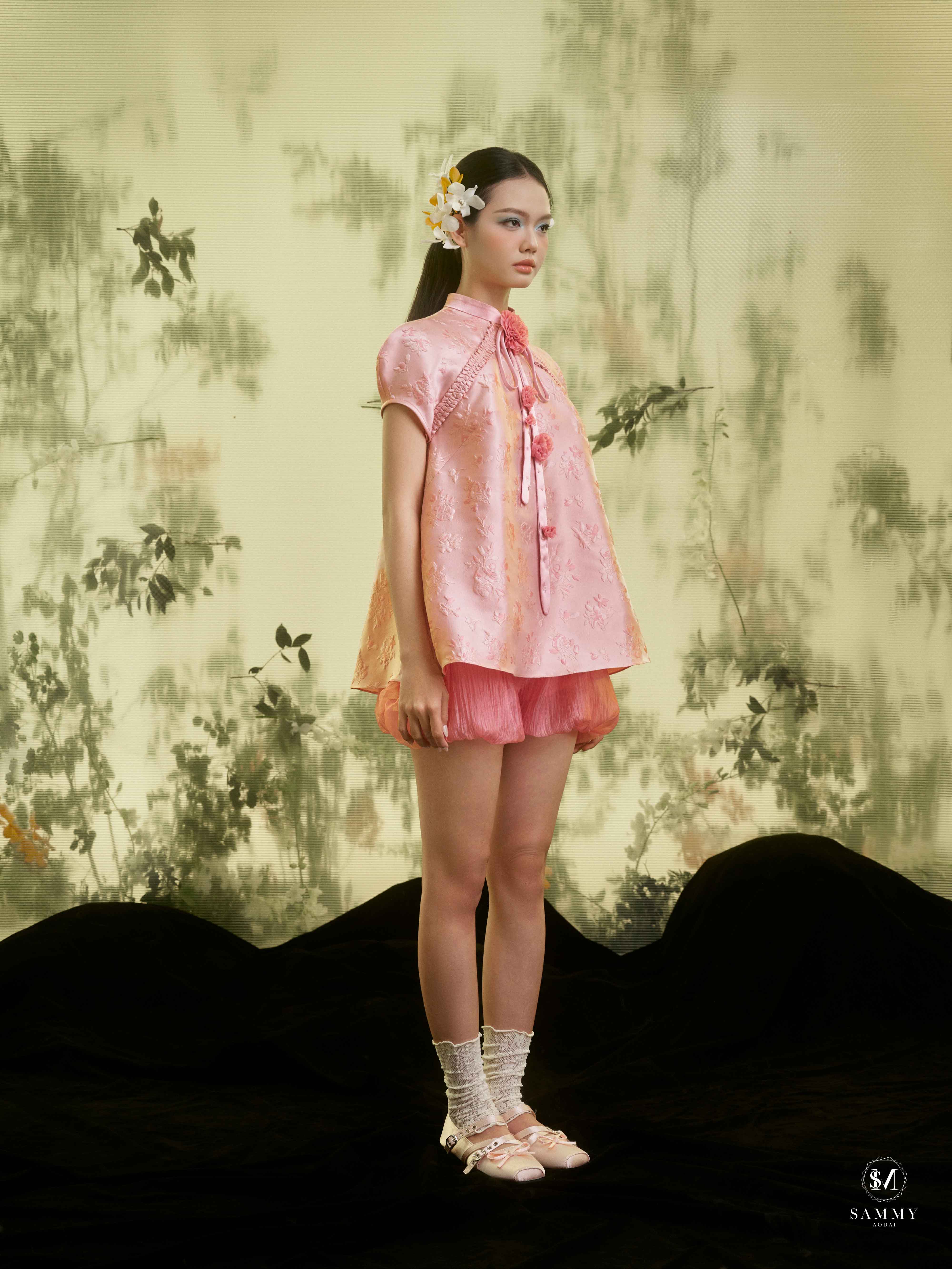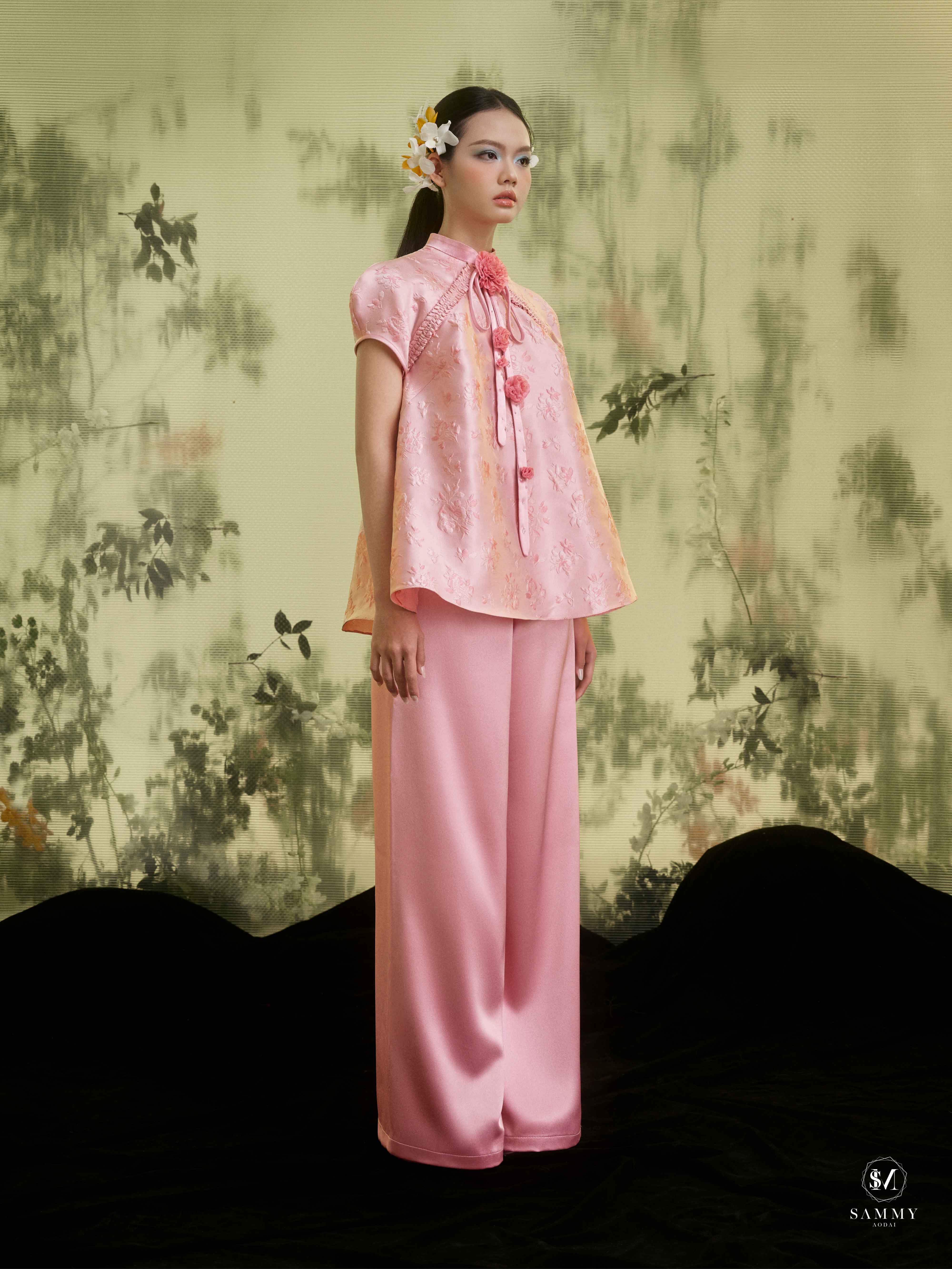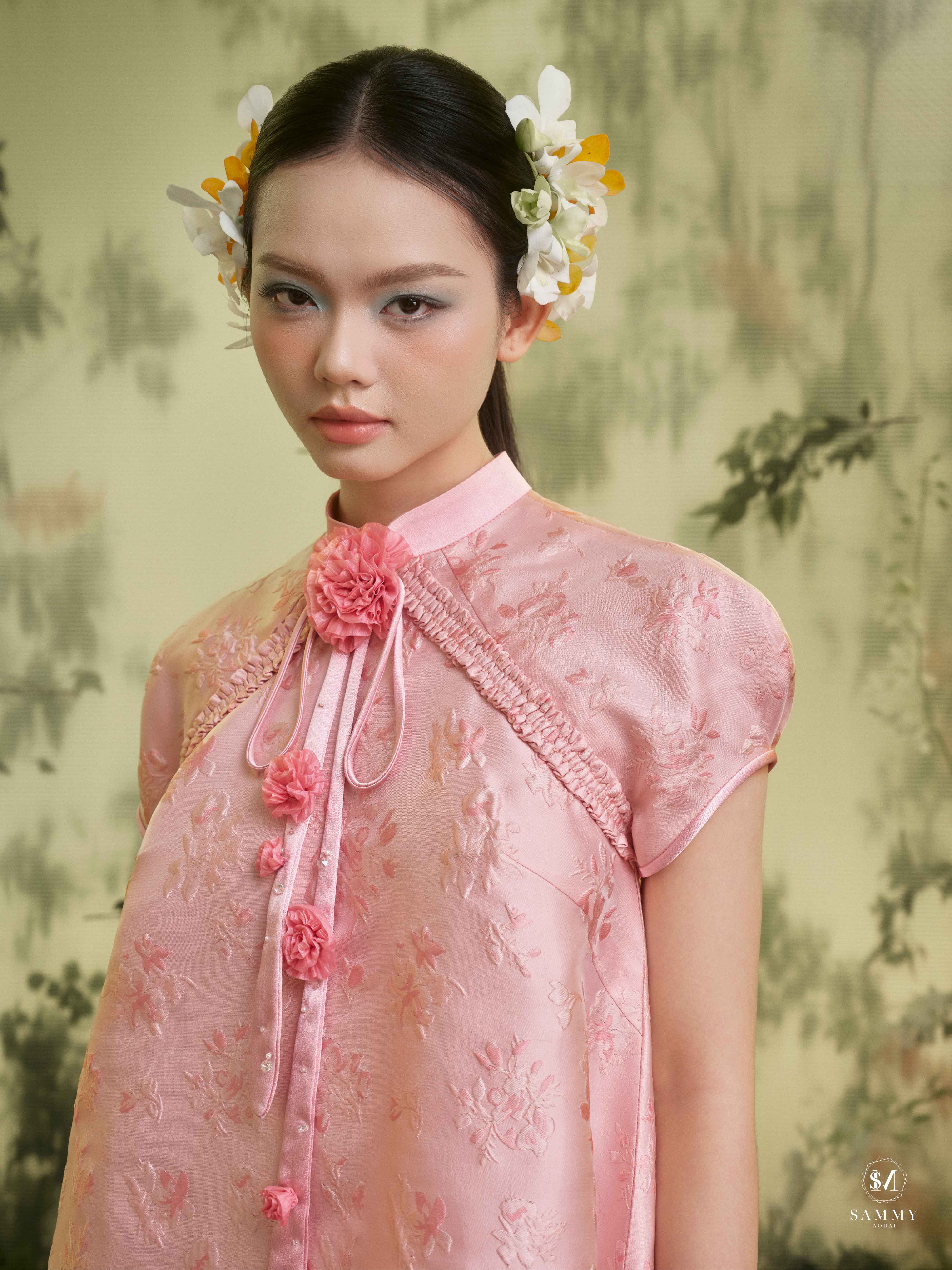 Nguồn cảm hứng của Áo dài Sammy đến từ những biểu tượng tình yêu vượt thời gian (chim công, hoa bướm, cá nước, nghệ thuật điêu khắc …), mềm mại nhưng pha nét quyến rũ của hơi thở đương đại