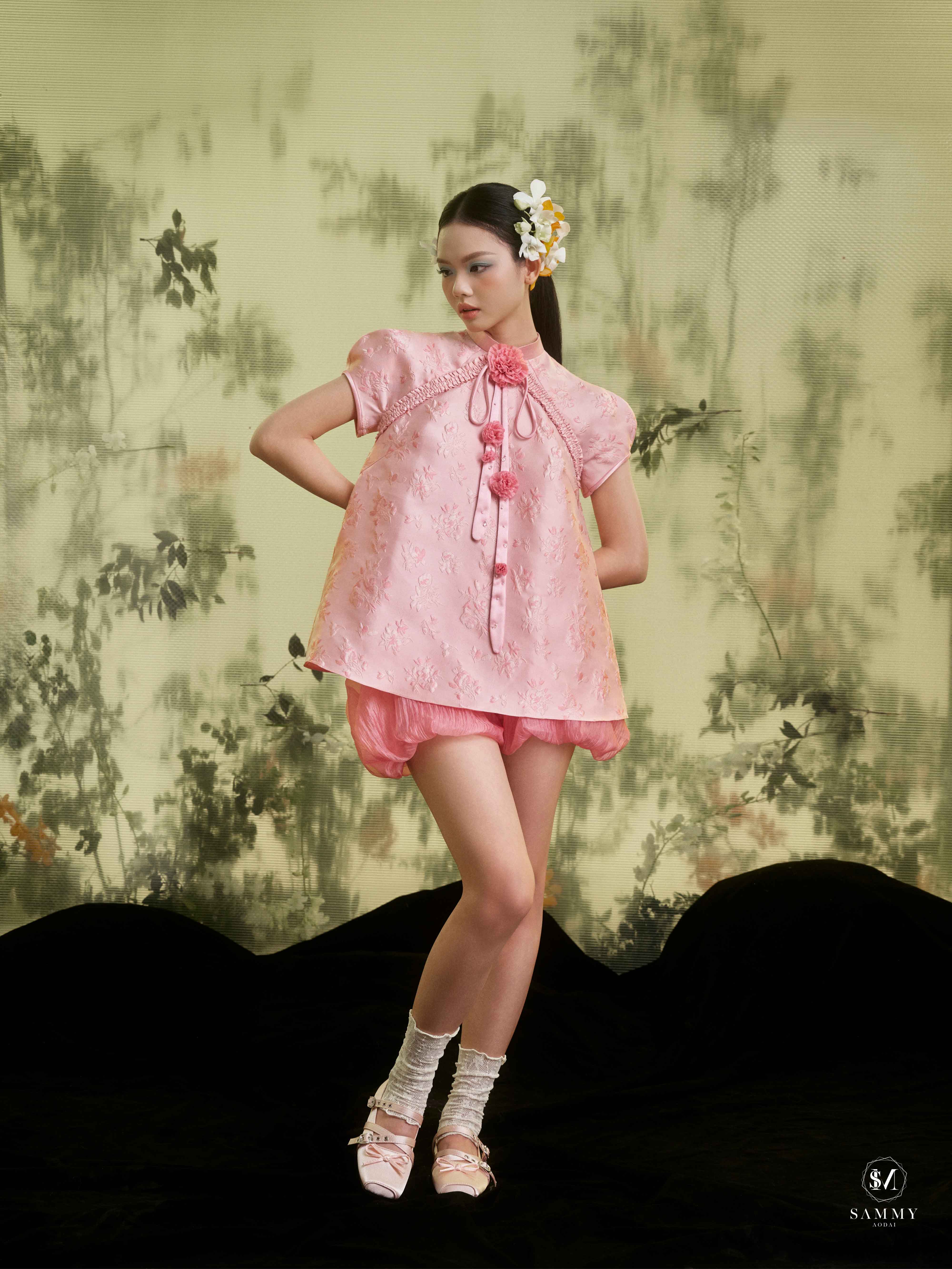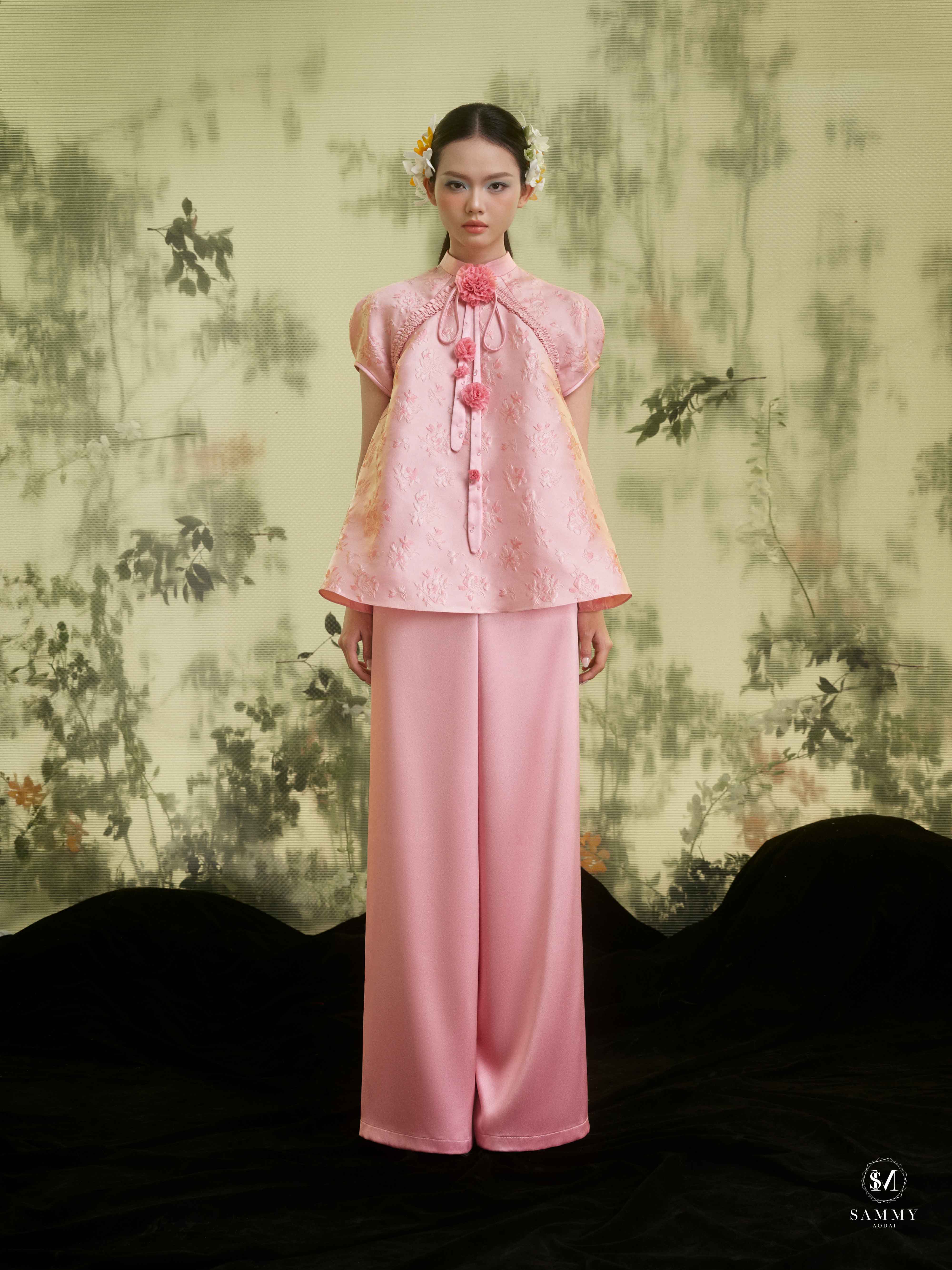 Chất liệu: Áo hoa nhí hồng / Quần lụa thái hồng